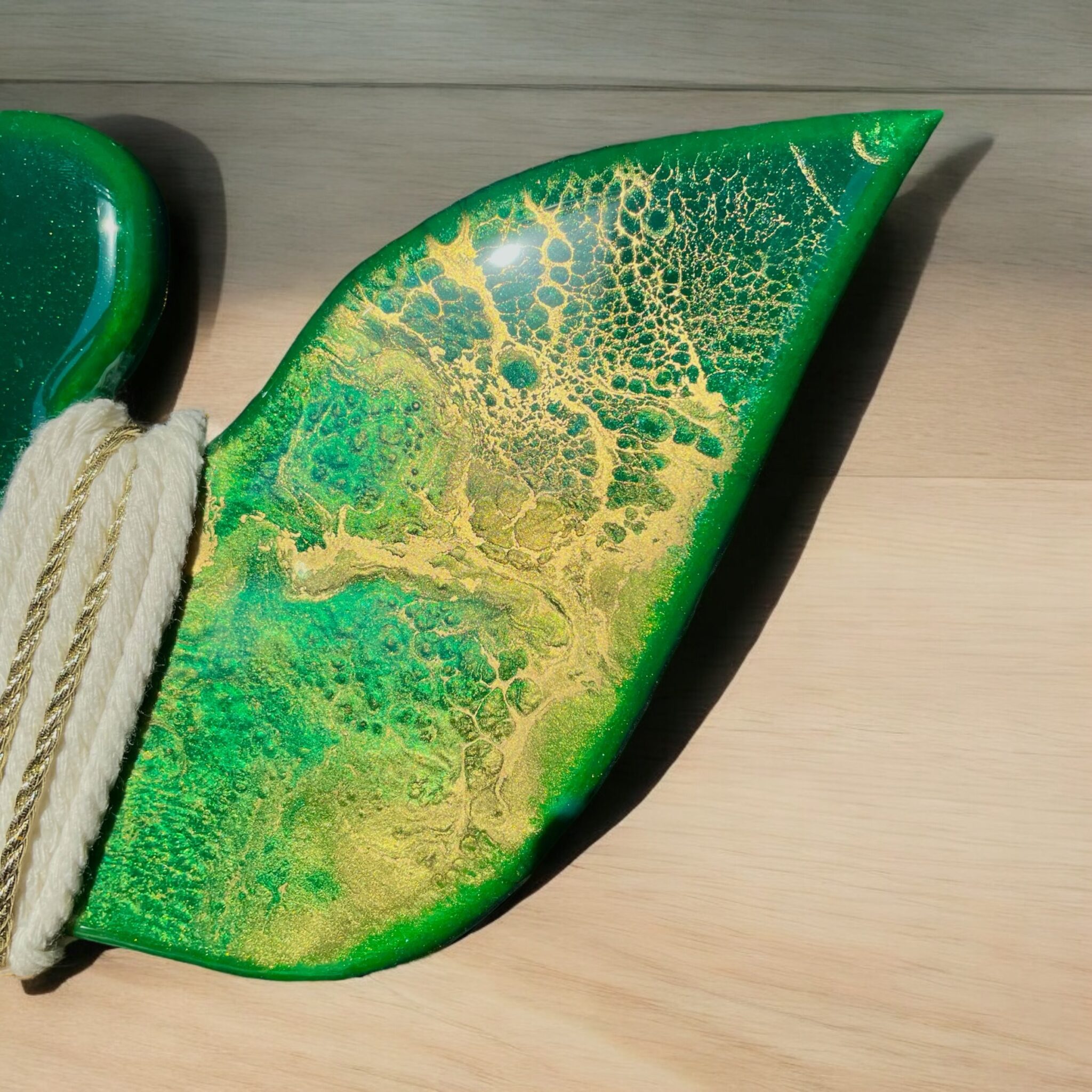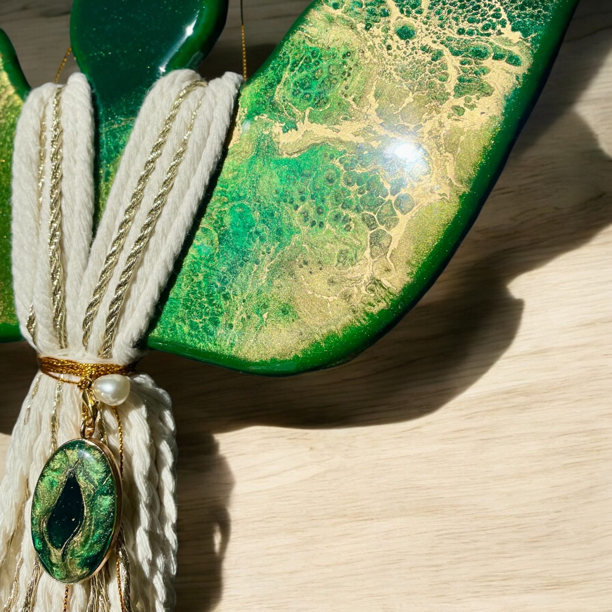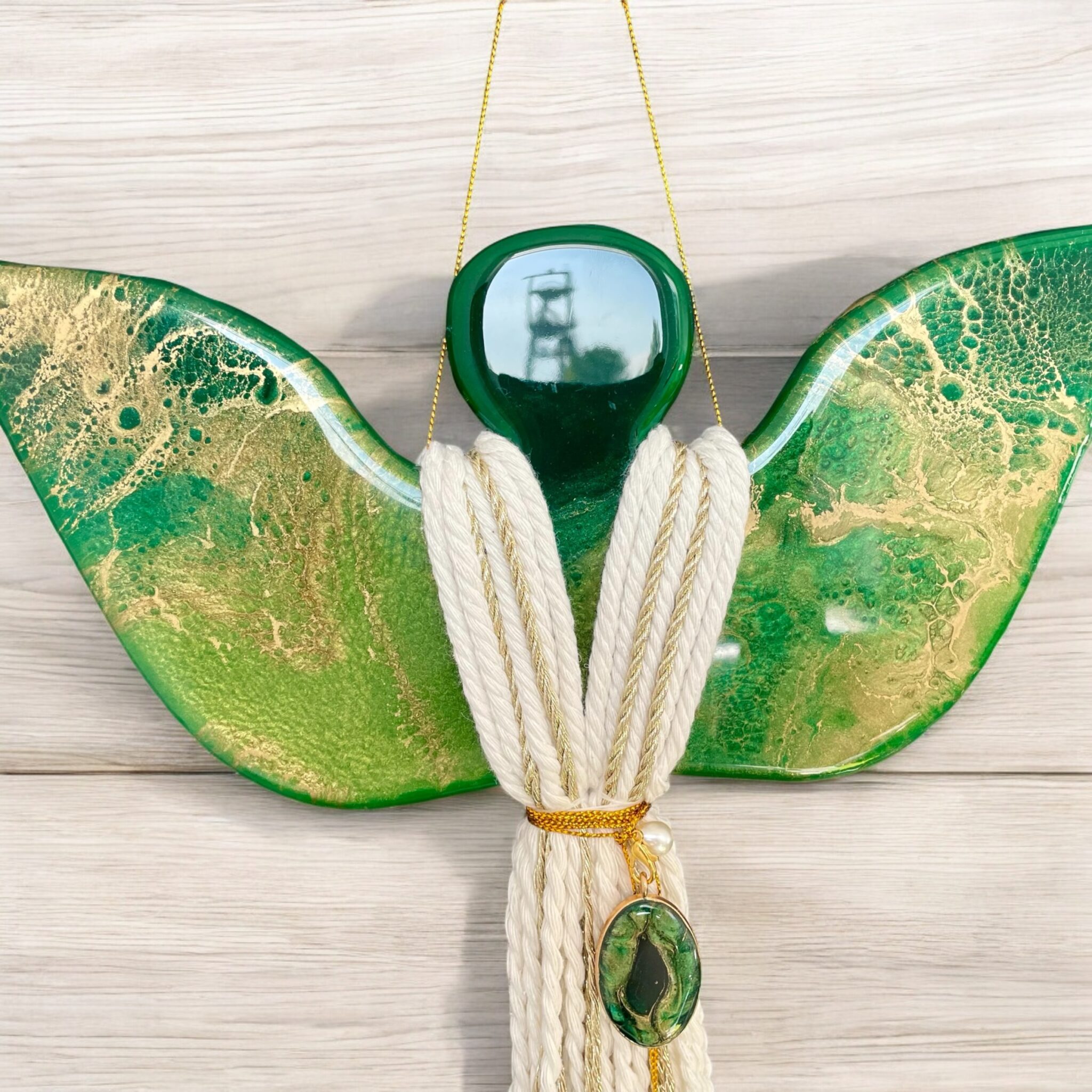 Ten wyjątkowy anioł ma szerokość skrzydeł 28 cm i długość całkowitą 70 cm, a jego zjawiskowe odcienie zieleni w połączeniu z eleganckim złotem tworzą unikalną kompozycję. Dodatkowo, anioł ozdobiony jest biżuterią wykonaną przeze mnie z żywicy epoksydowej, idealnie wpisującą się w kolorystykę dzieła.