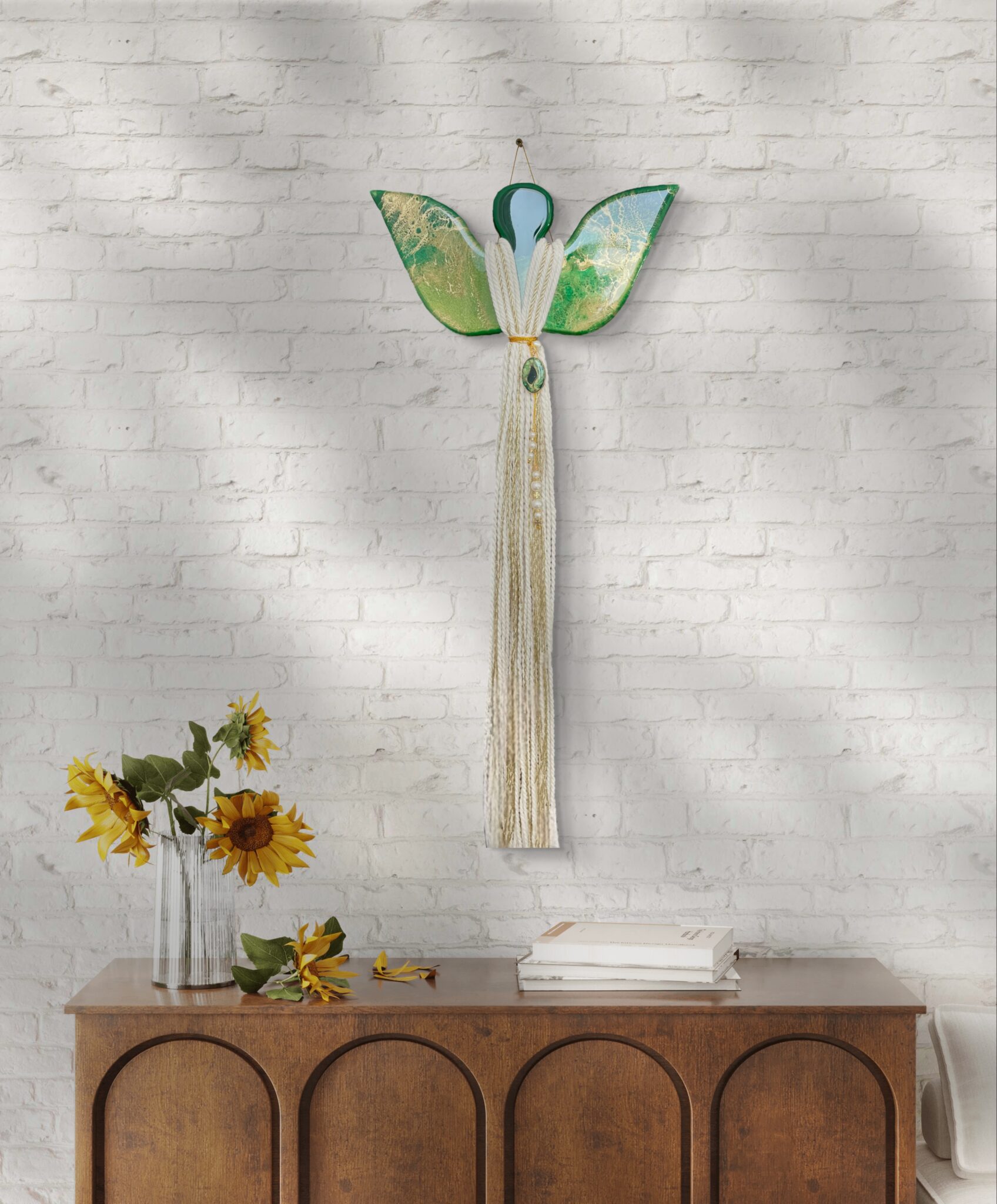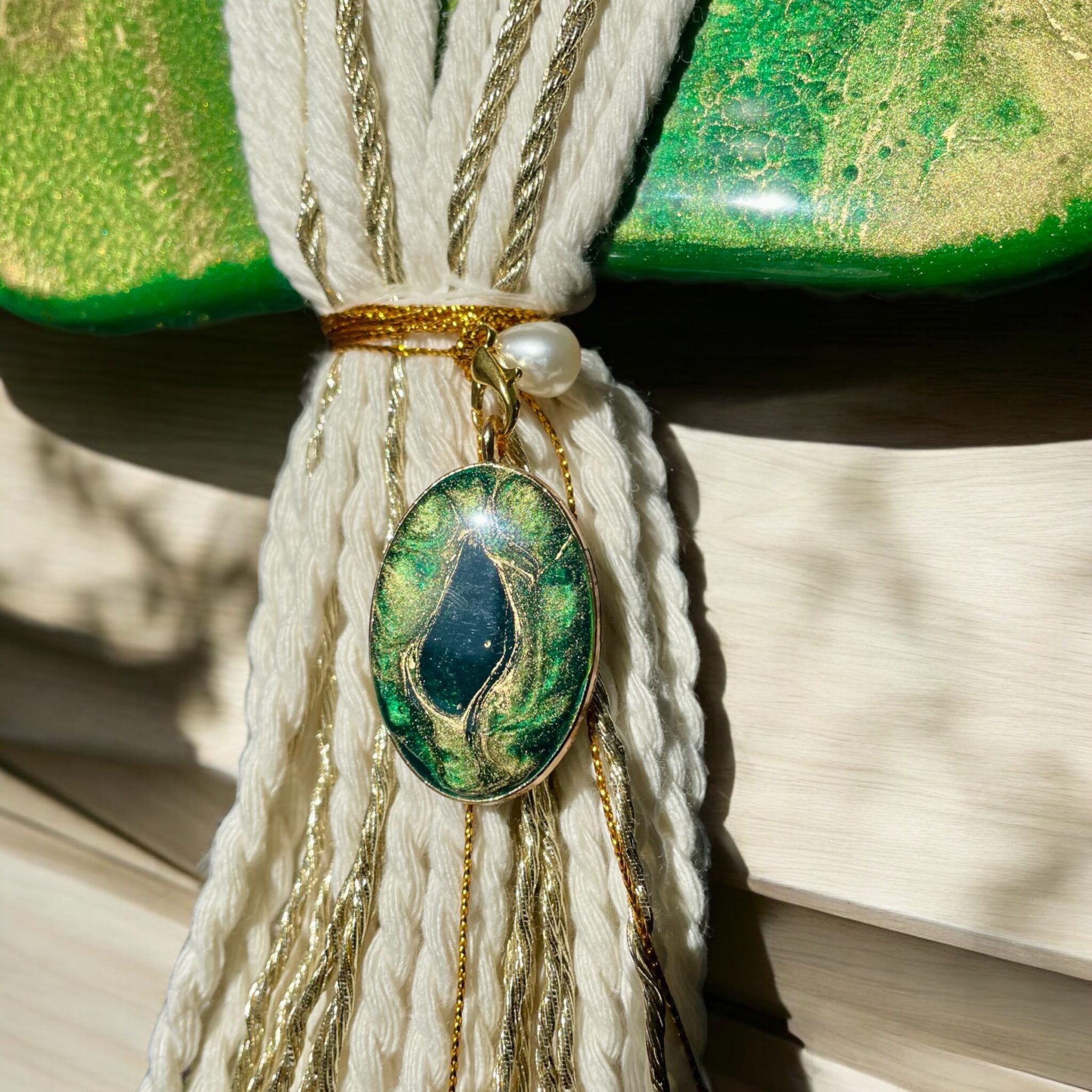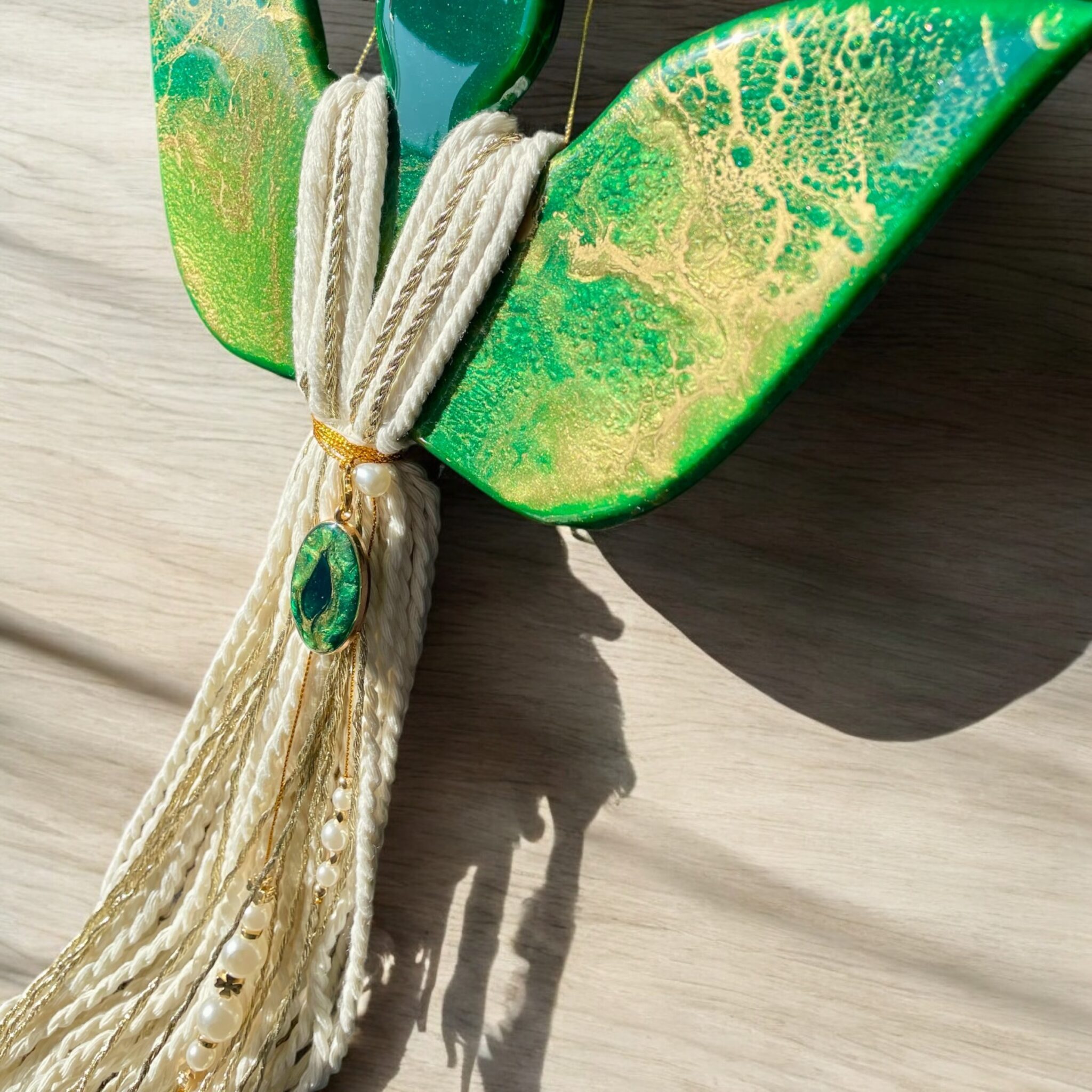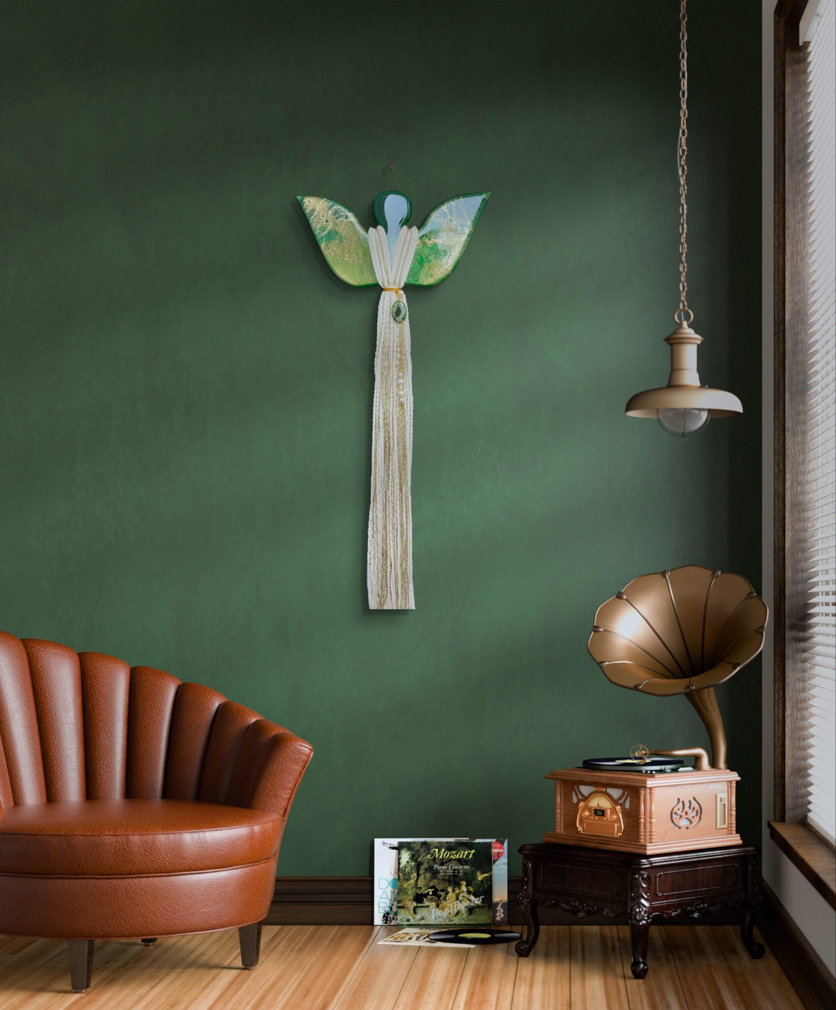 Ten wyjątkowy anioł ma szerokość skrzydeł 28 cm i długość całkowitą 70 cm, a jego zjawiskowe odcienie zieleni w połączeniu z eleganckim złotem tworzą unikalną kompozycję. Dodatkowo, anioł ozdobiony jest biżuterią wykonaną przeze mnie z żywicy epoksydowej, idealnie wpisującą się w kolorystykę dzieła.