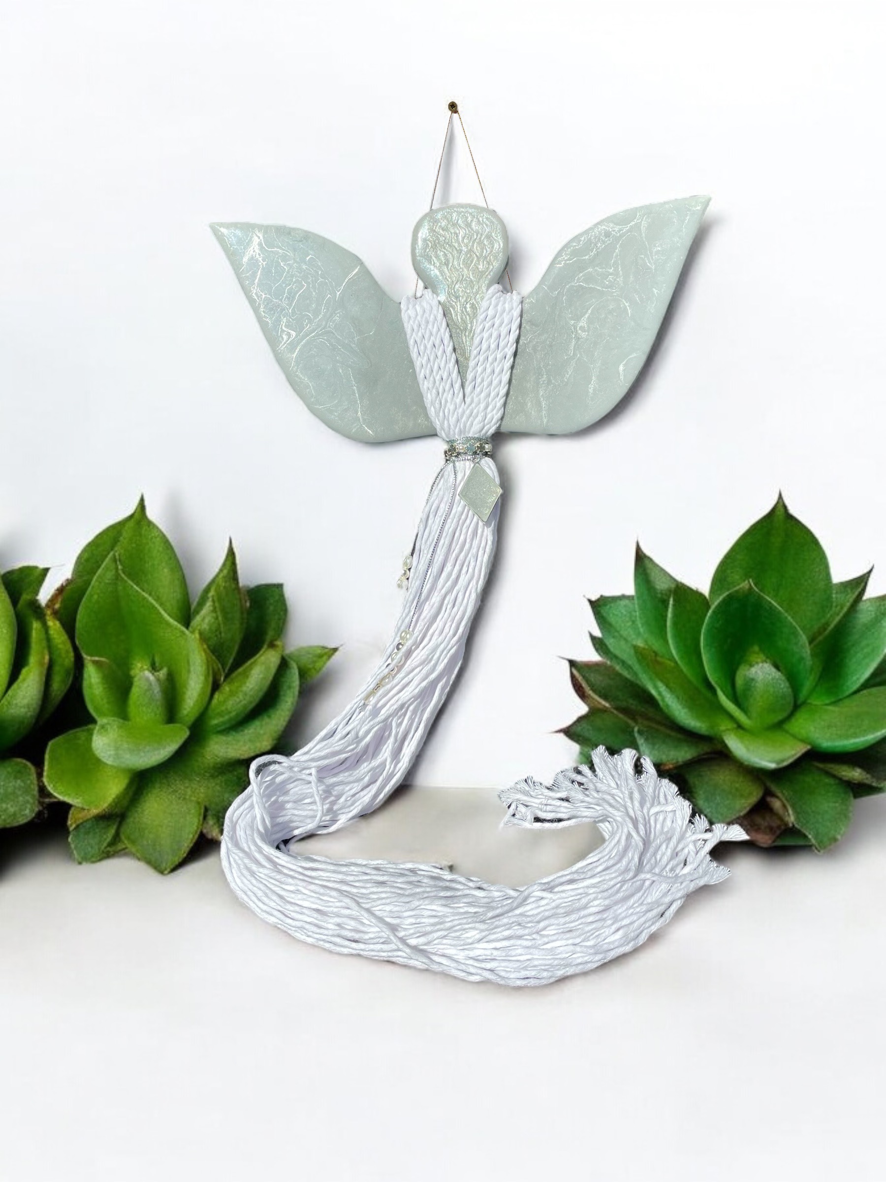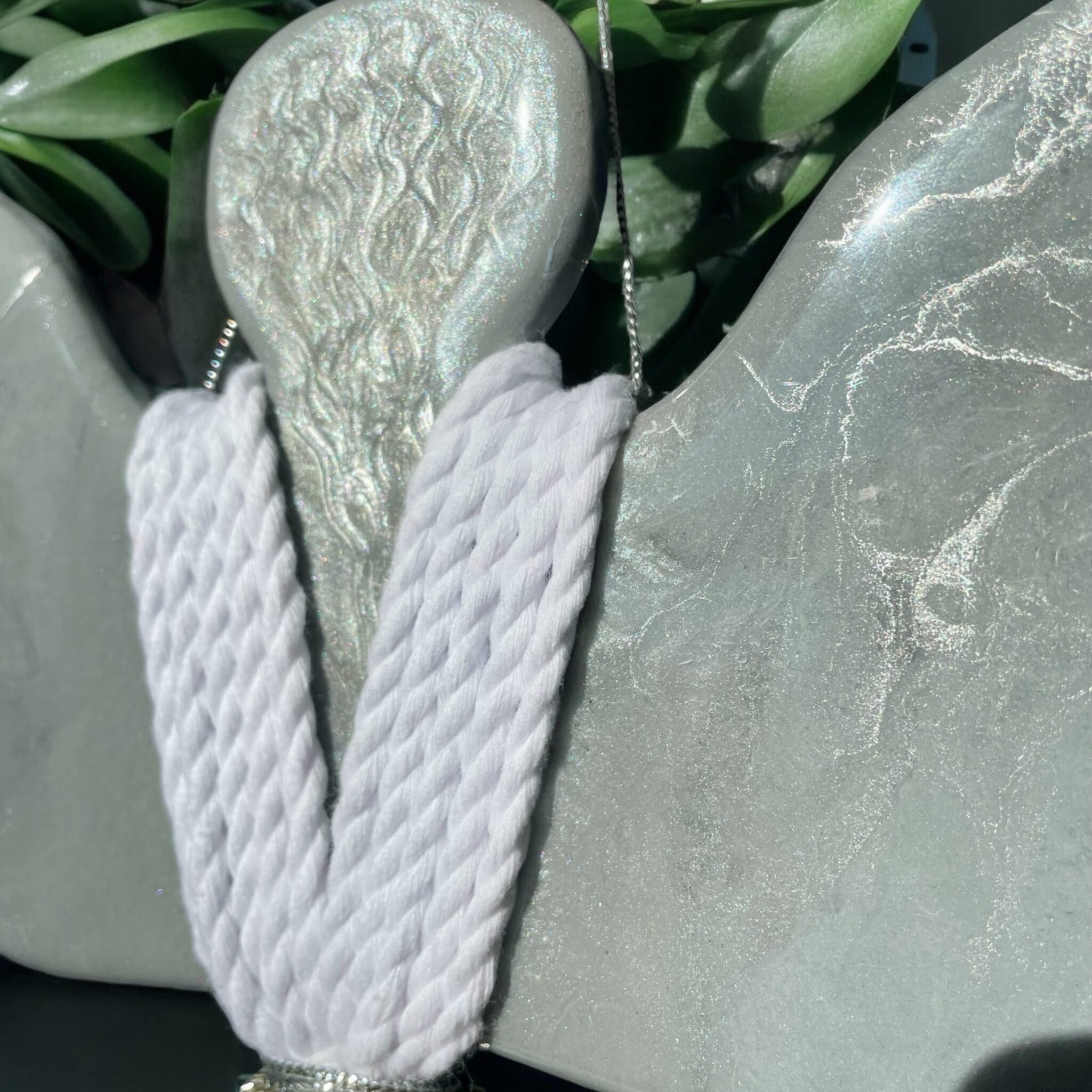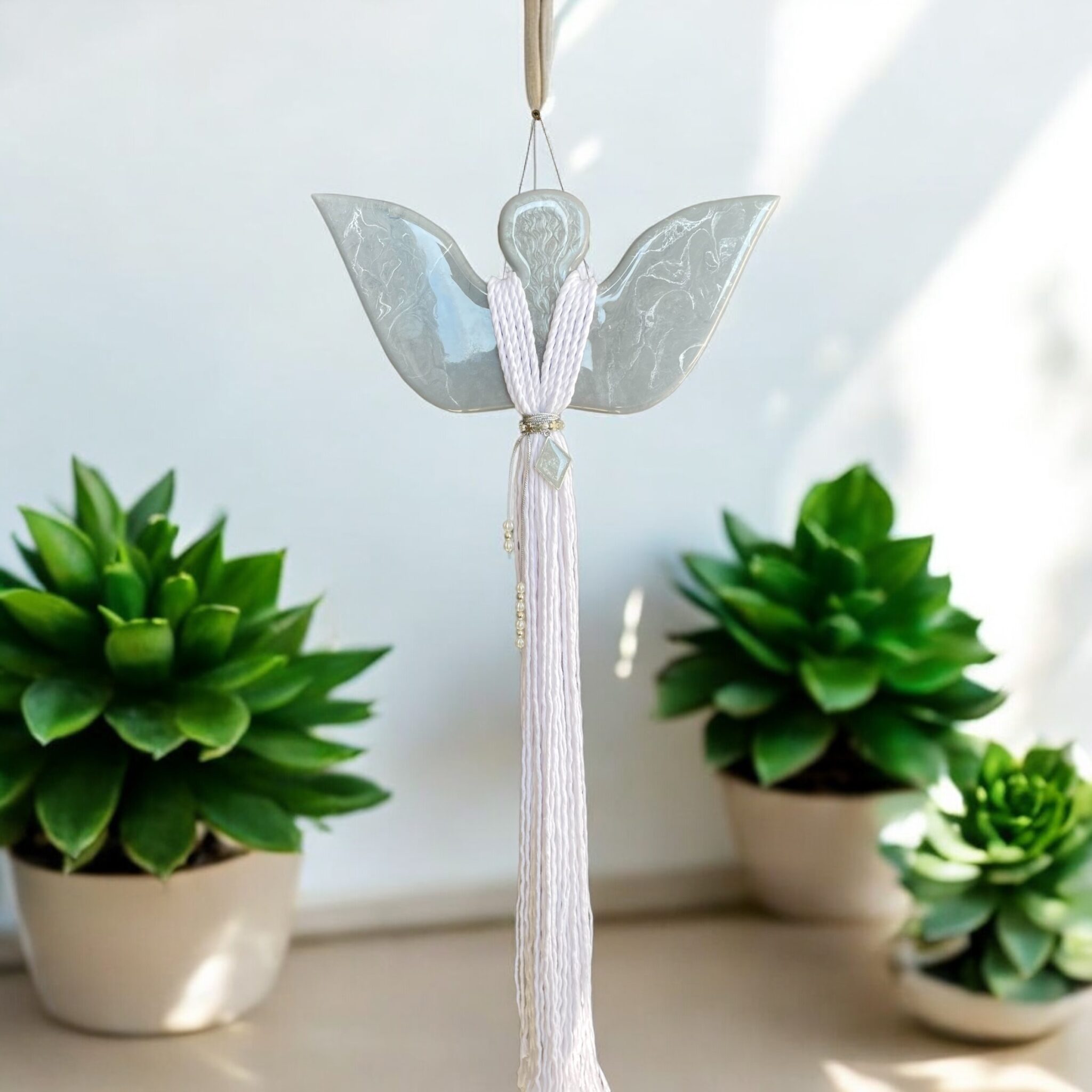 Jego piękno dopełniają odcienie szarości w połączeniu ze srebrnymi akcentami, które nadają mu elegancki i nowoczesny charakter. Anioł nosi również biżuterię w kształcie rombu – wykonana z szarej żywicy epoksydowej z dodatkiem srebrnego brokatu, przyciągnie wzrok i stworzy niepowtarzalny klimat.