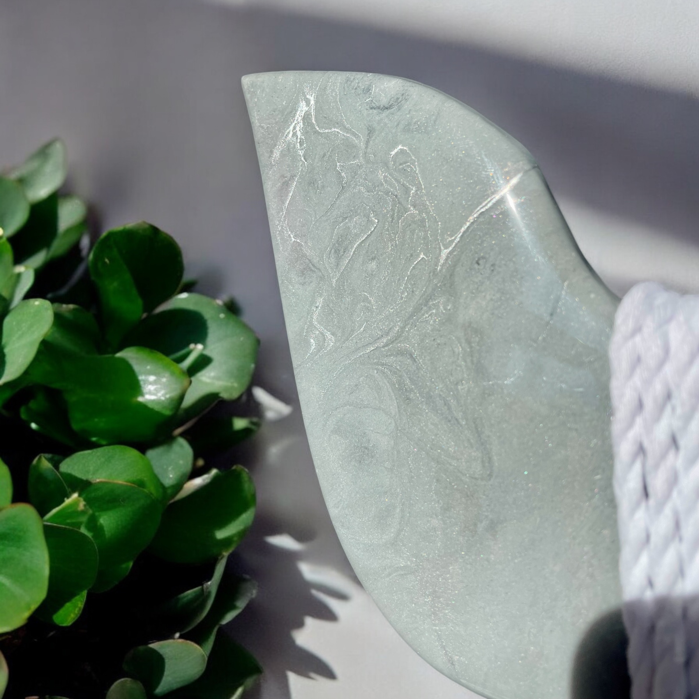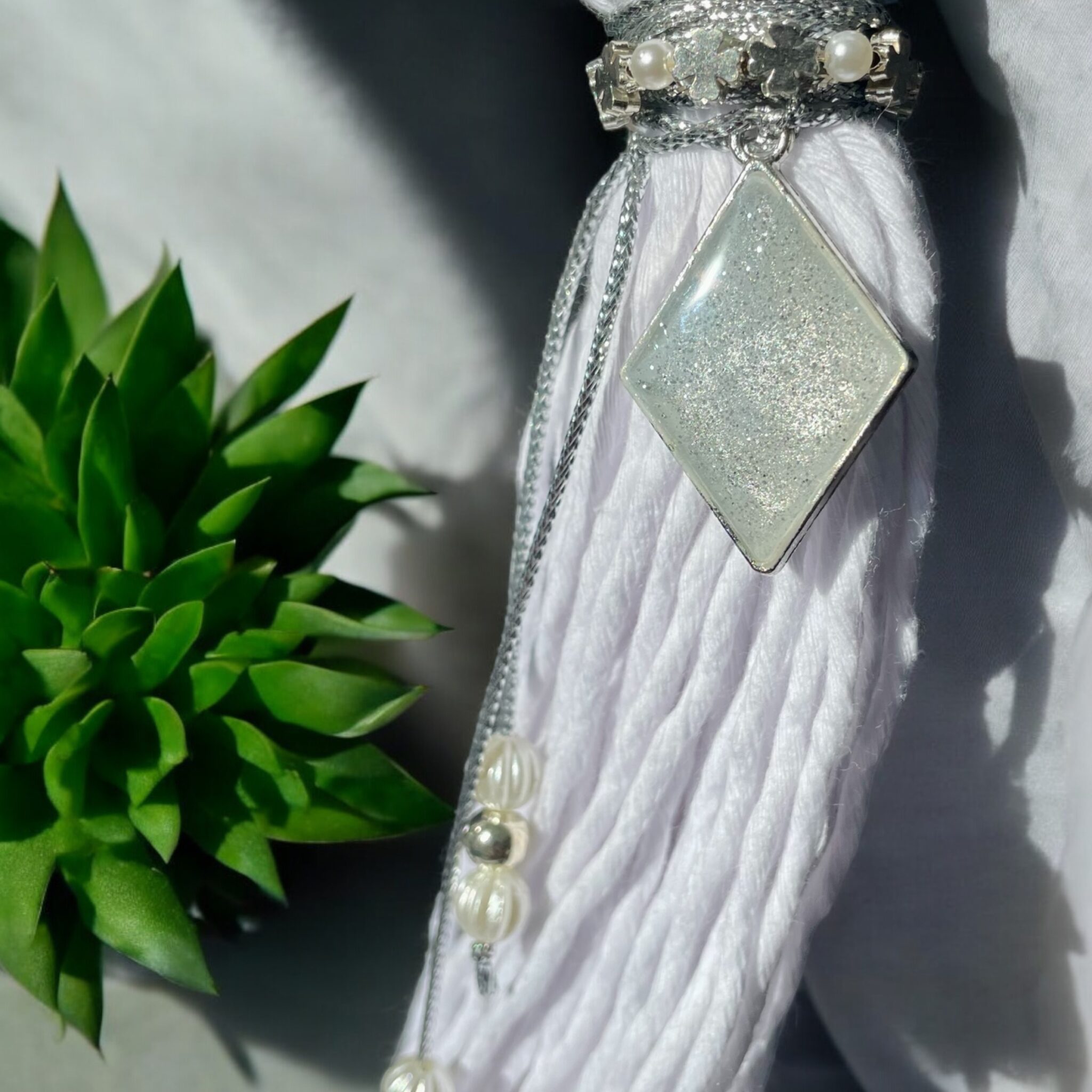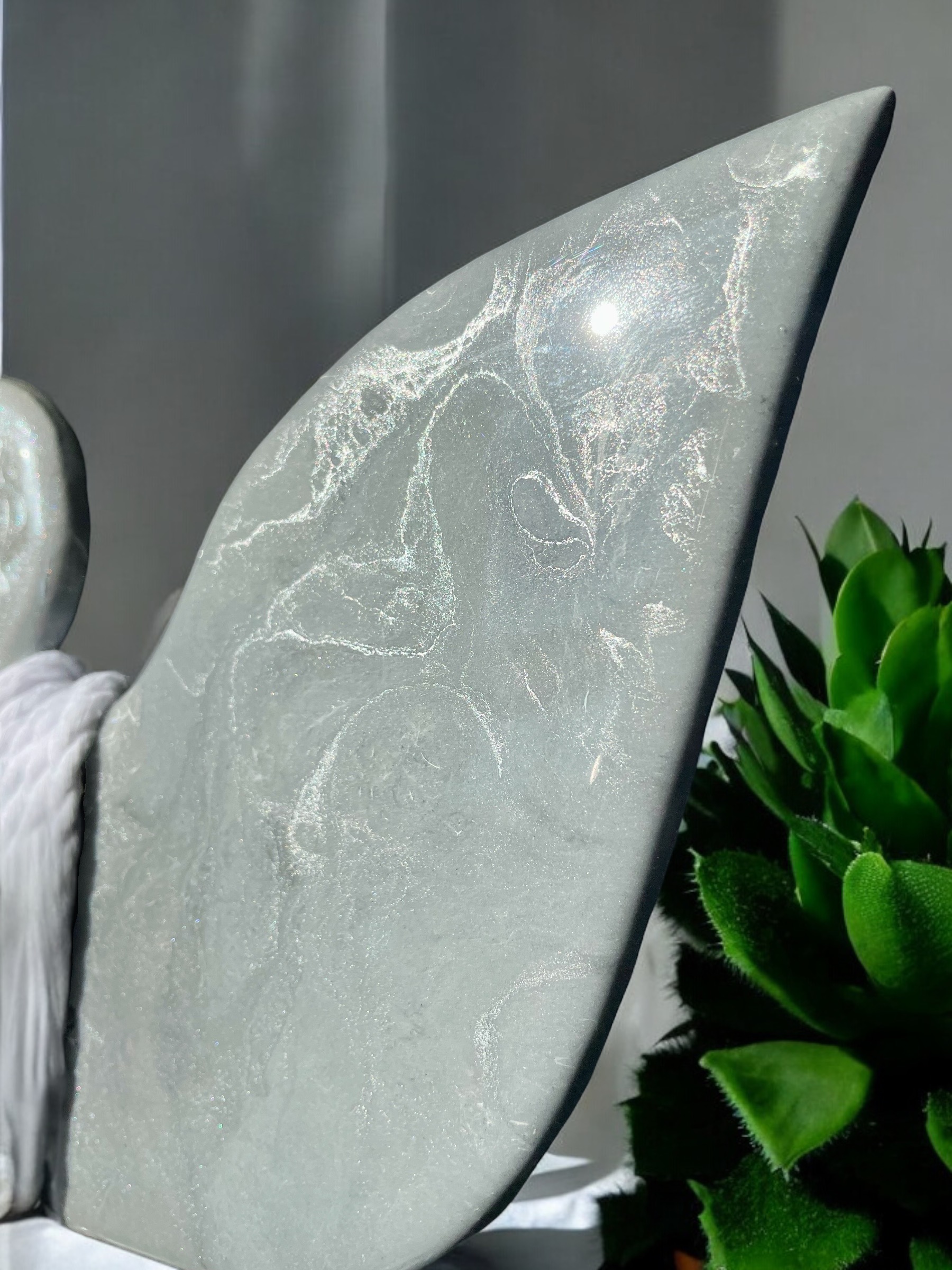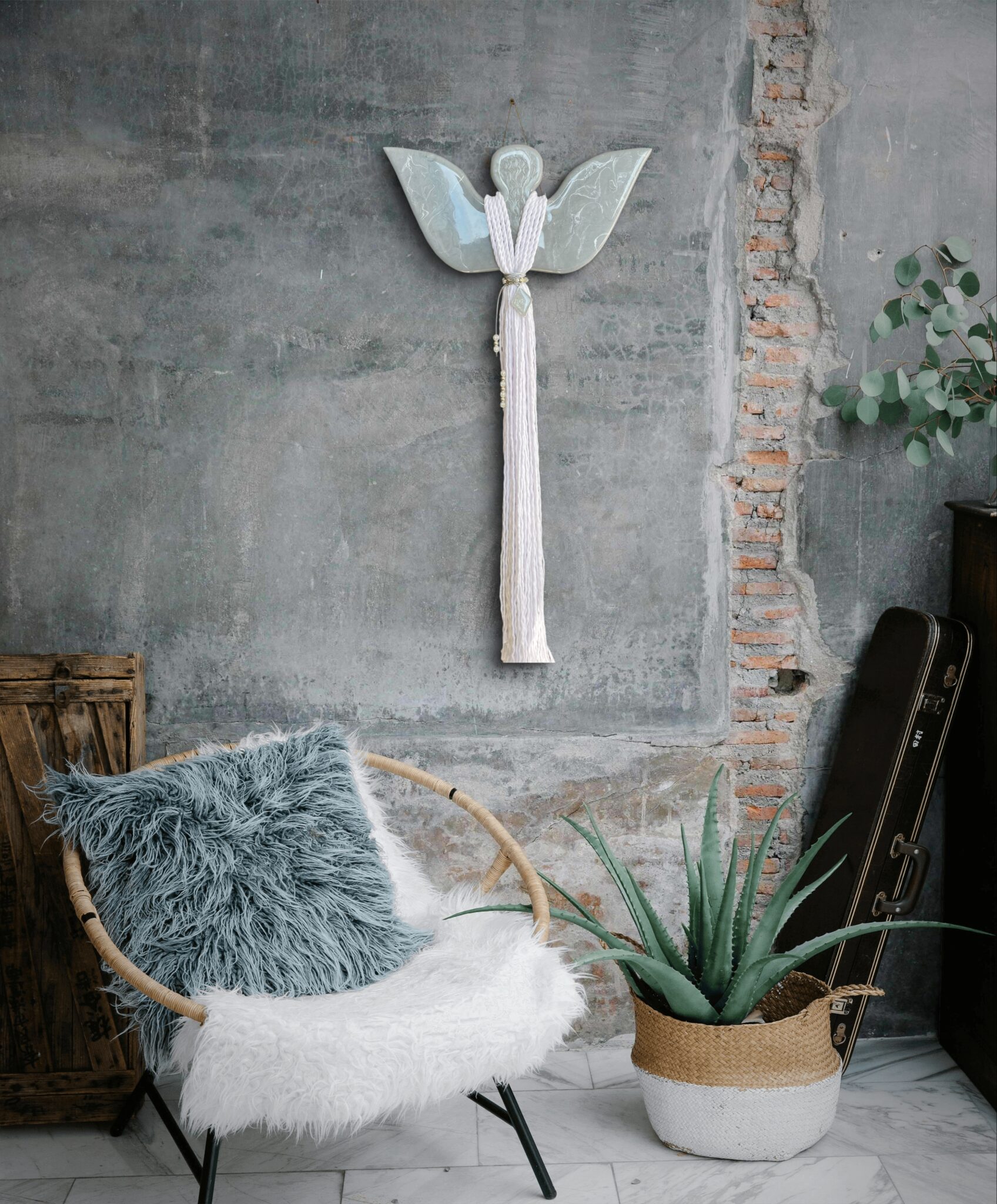 Jego piękno dopełniają odcienie szarości w połączeniu ze srebrnymi akcentami, które nadają mu elegancki i nowoczesny charakter. Anioł nosi również biżuterię w kształcie rombu – wykonana z szarej żywicy epoksydowej z dodatkiem srebrnego brokatu, przyciągnie wzrok i stworzy niepowtarzalny klimat.