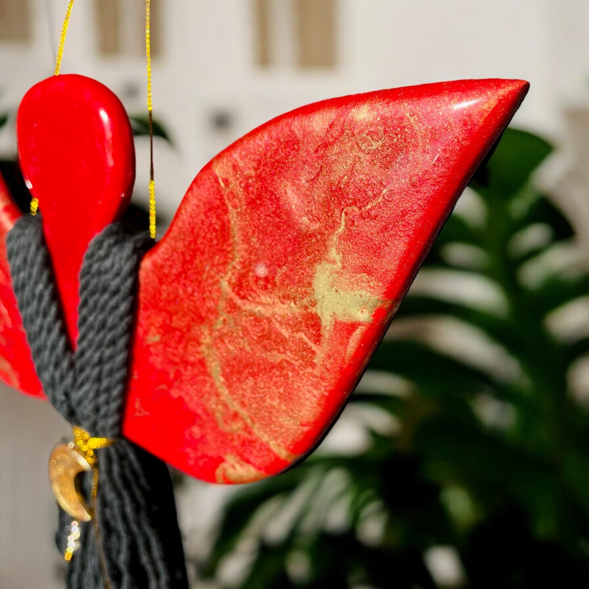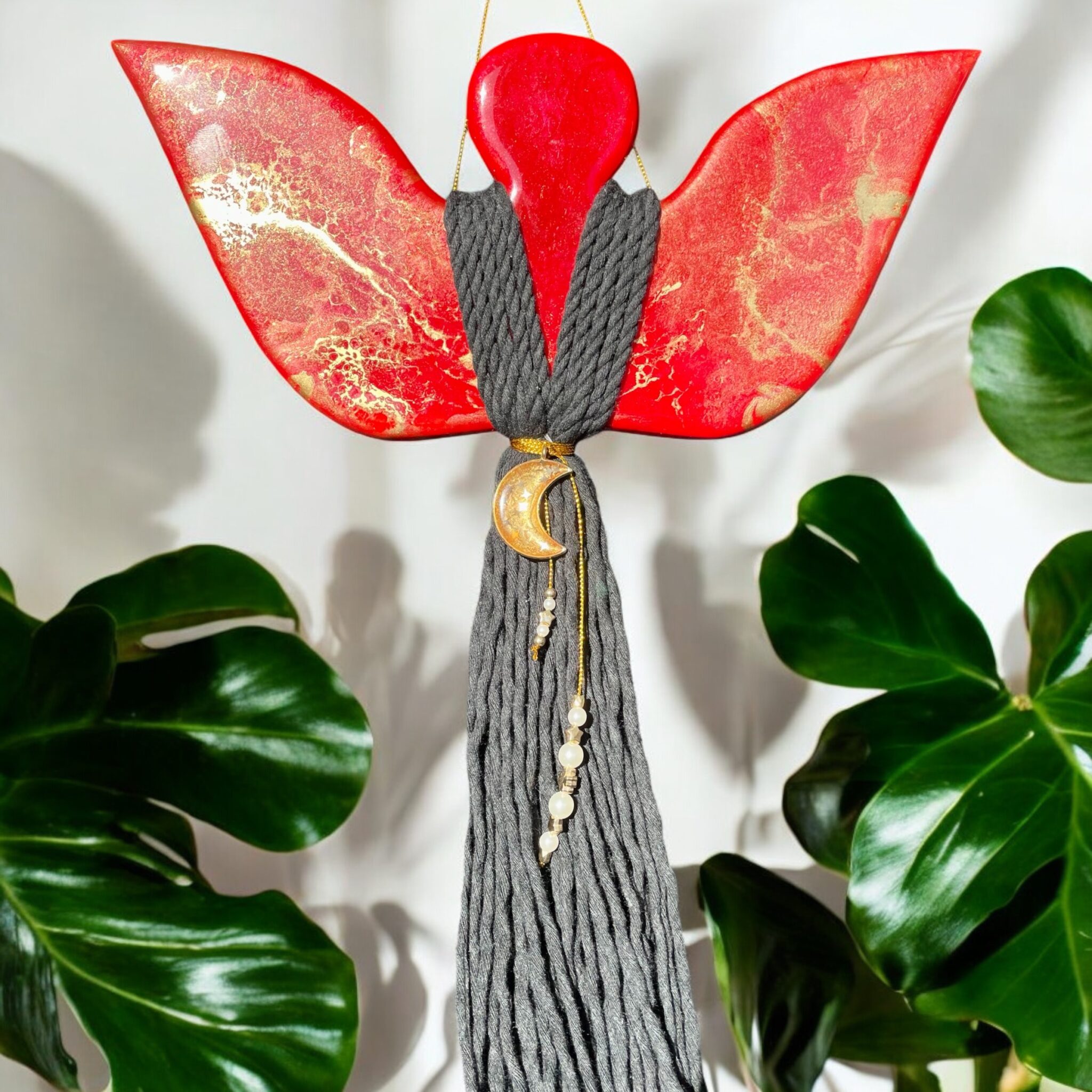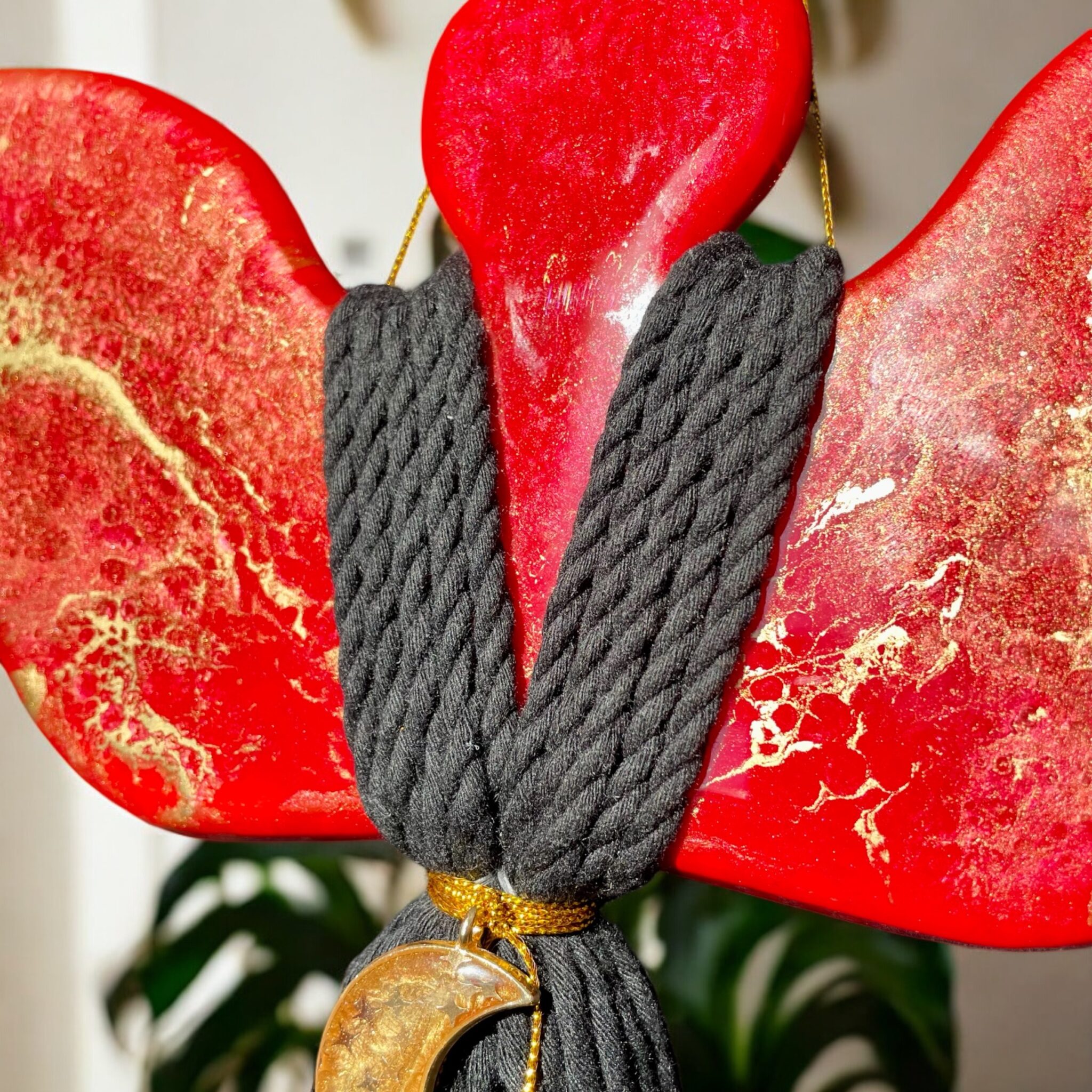 Z szerokością skrzydeł wynoszącą 28 cm i długością całkowitą 90 cm, ten anioł przyciąga uwagę swoją soczystą czerwienią oraz eleganckim złotym akcentem. Jako wyjątkowy dodatek, anioł nosi ręcznie wykonaną biżuterię w kształcie księżyca, również z żywicy epoksydowej w kolorze złotym, co dodaje mu niepowtarzalnego charakteru.