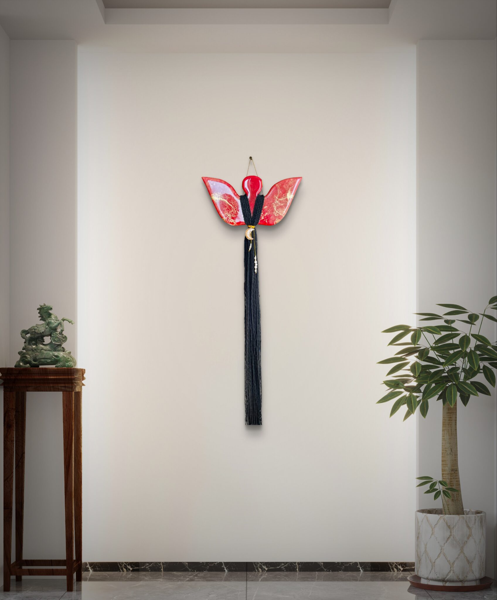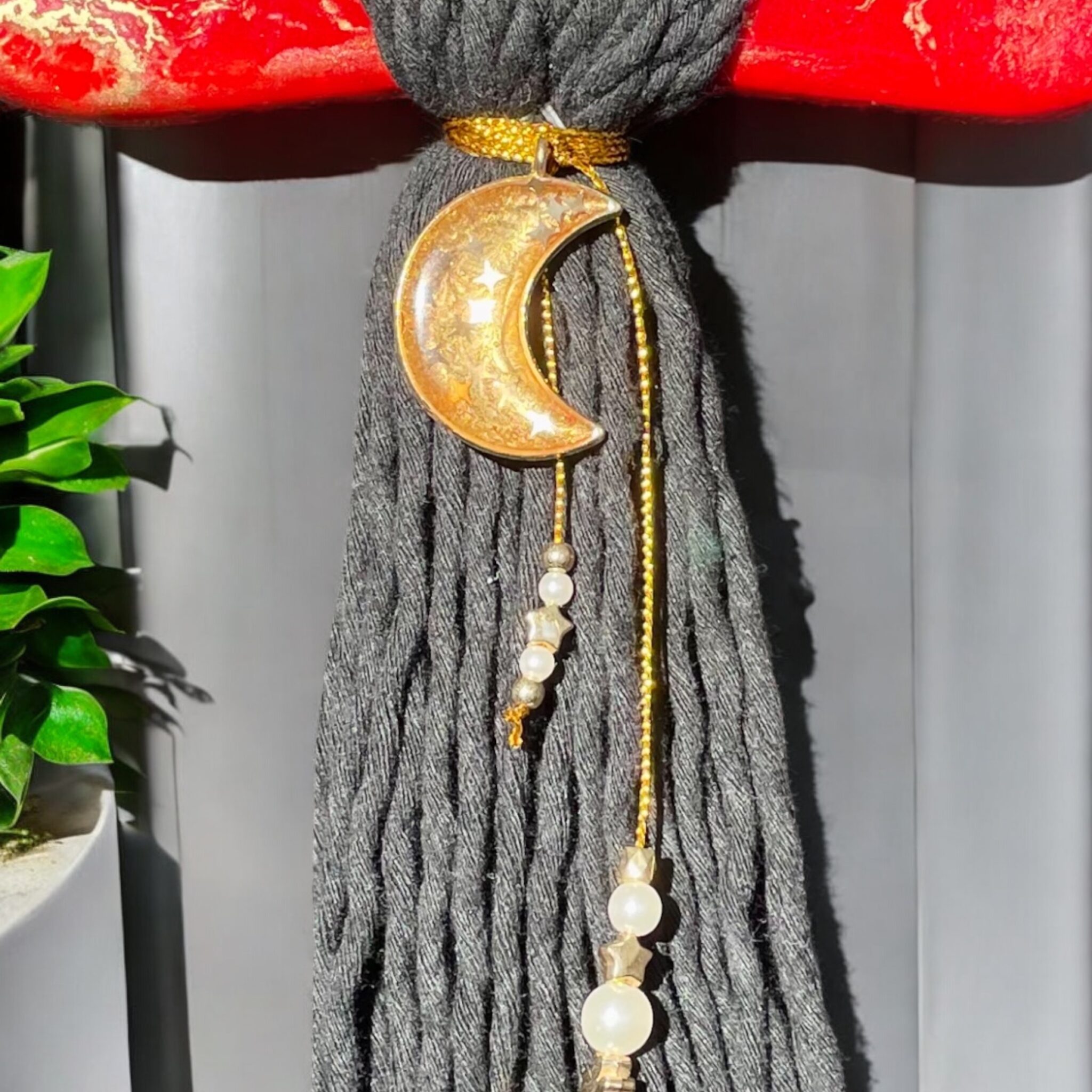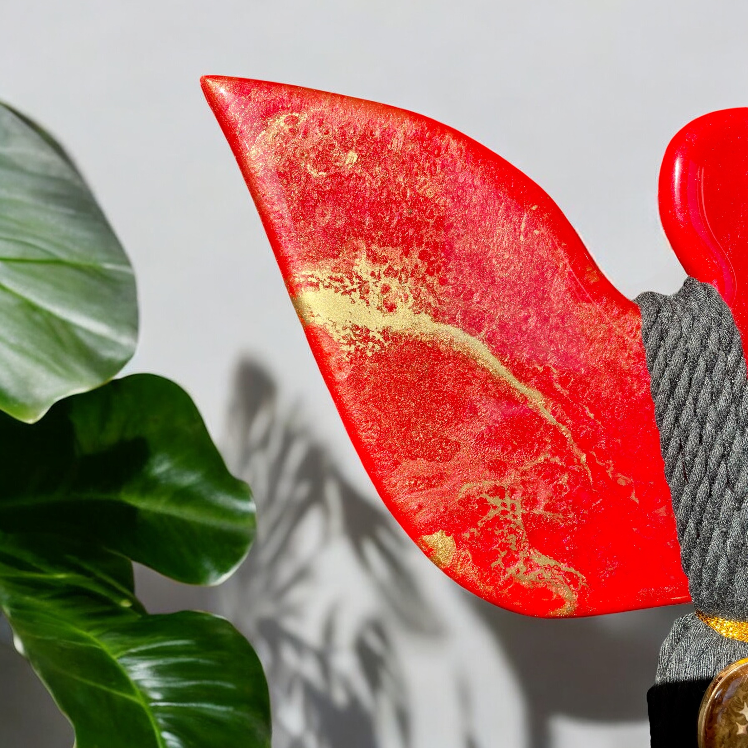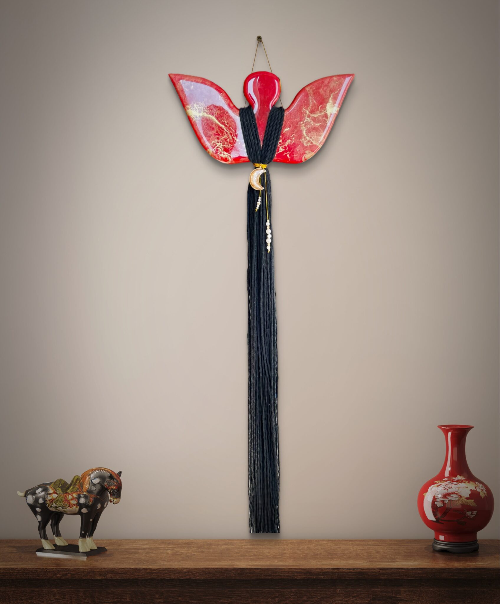 Z szerokością skrzydeł wynoszącą 28 cm i długością całkowitą 90 cm, ten anioł przyciąga uwagę swoją soczystą czerwienią oraz eleganckim złotym akcentem. Jako wyjątkowy dodatek, anioł nosi ręcznie wykonaną biżuterię w kształcie księżyca, również z żywicy epoksydowej w kolorze złotym, co dodaje mu niepowtarzalnego charakteru.