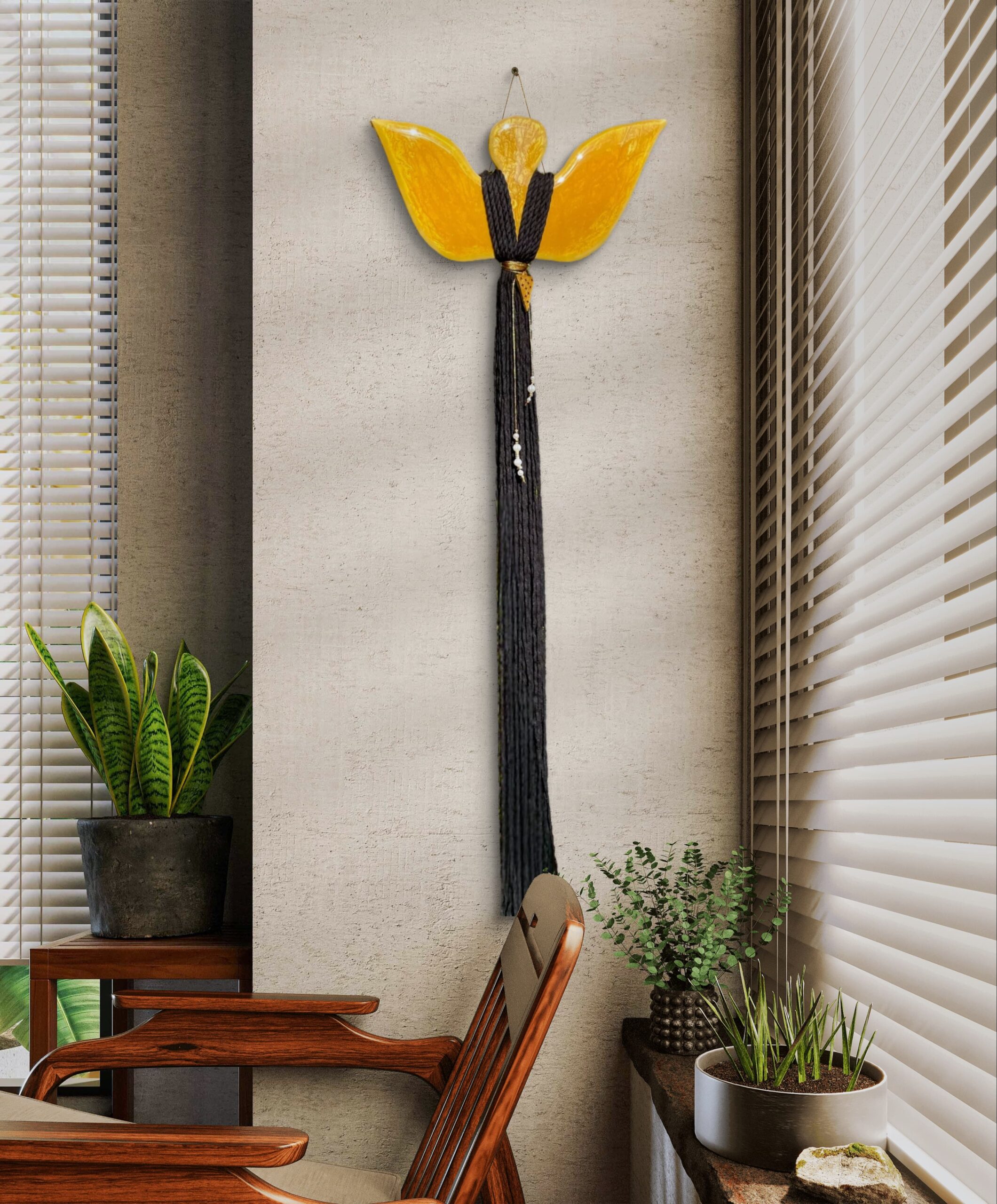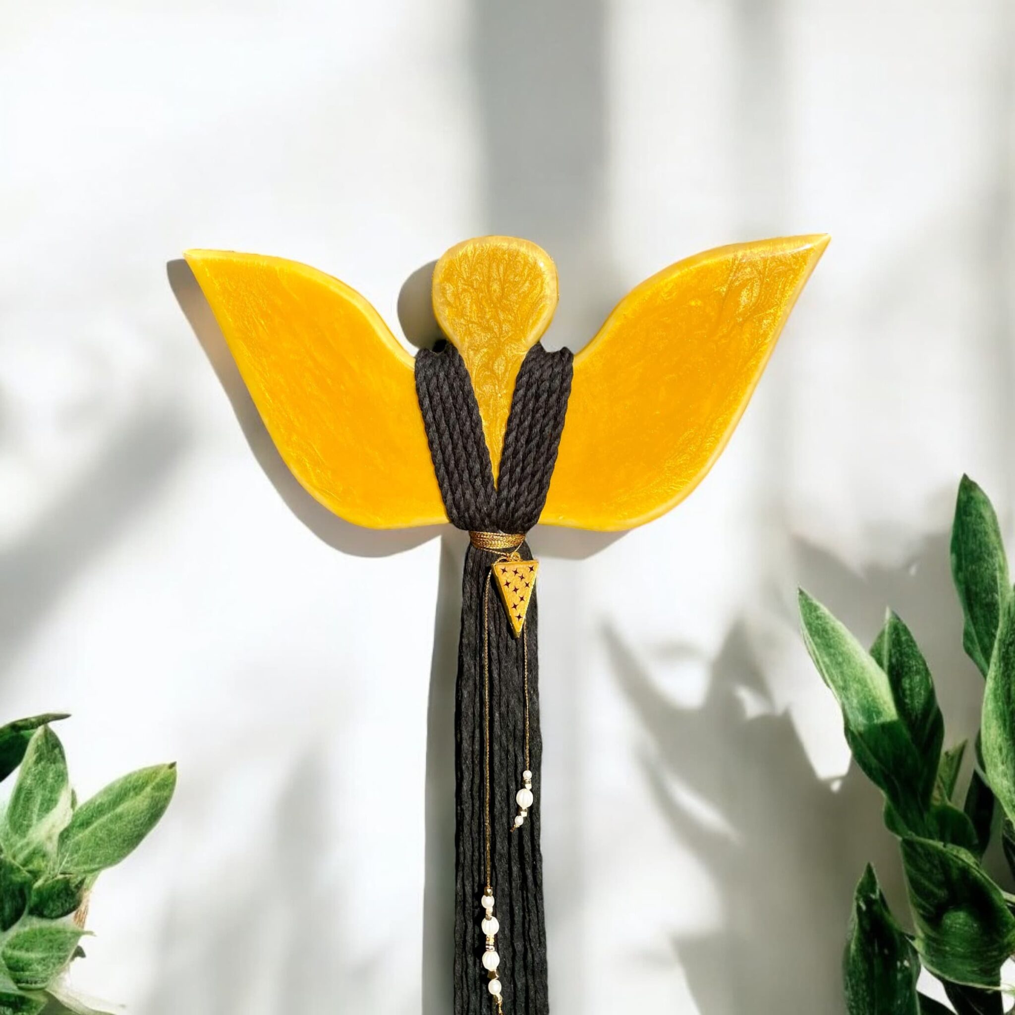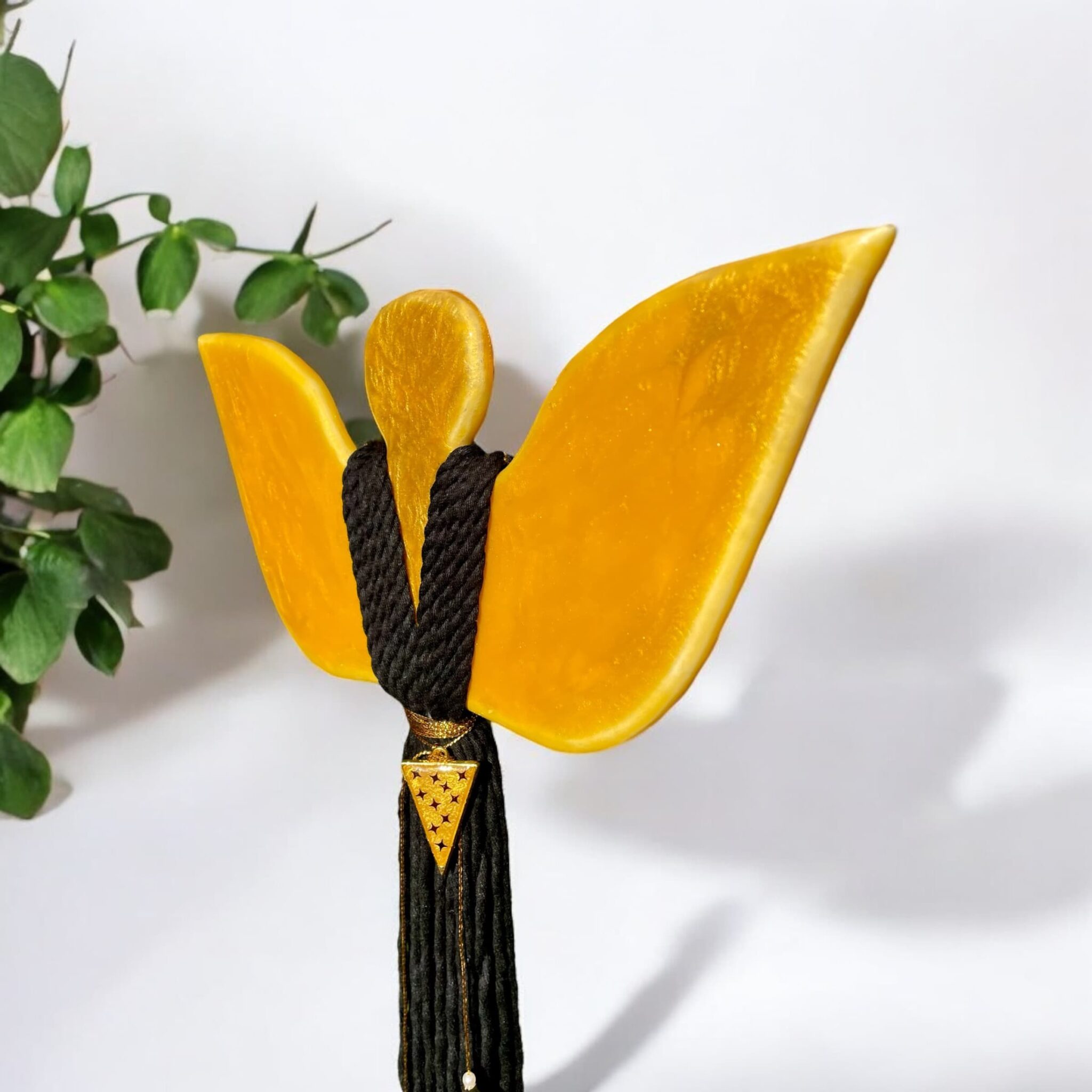 Ten zjawiskowy Anioł zachwyca głębokimi odcieniami złota, które w każdym wnętrzu dodają blasku i elegancji. Dodatkowo, jego biżuteria wykonana z żywicy epoksydowej w kształcie trójkąta, z pięknym złotym kolorem i czarnymi gwiazdkami, sprawia, że staje się jeszcze bardziej wyjątkowy.