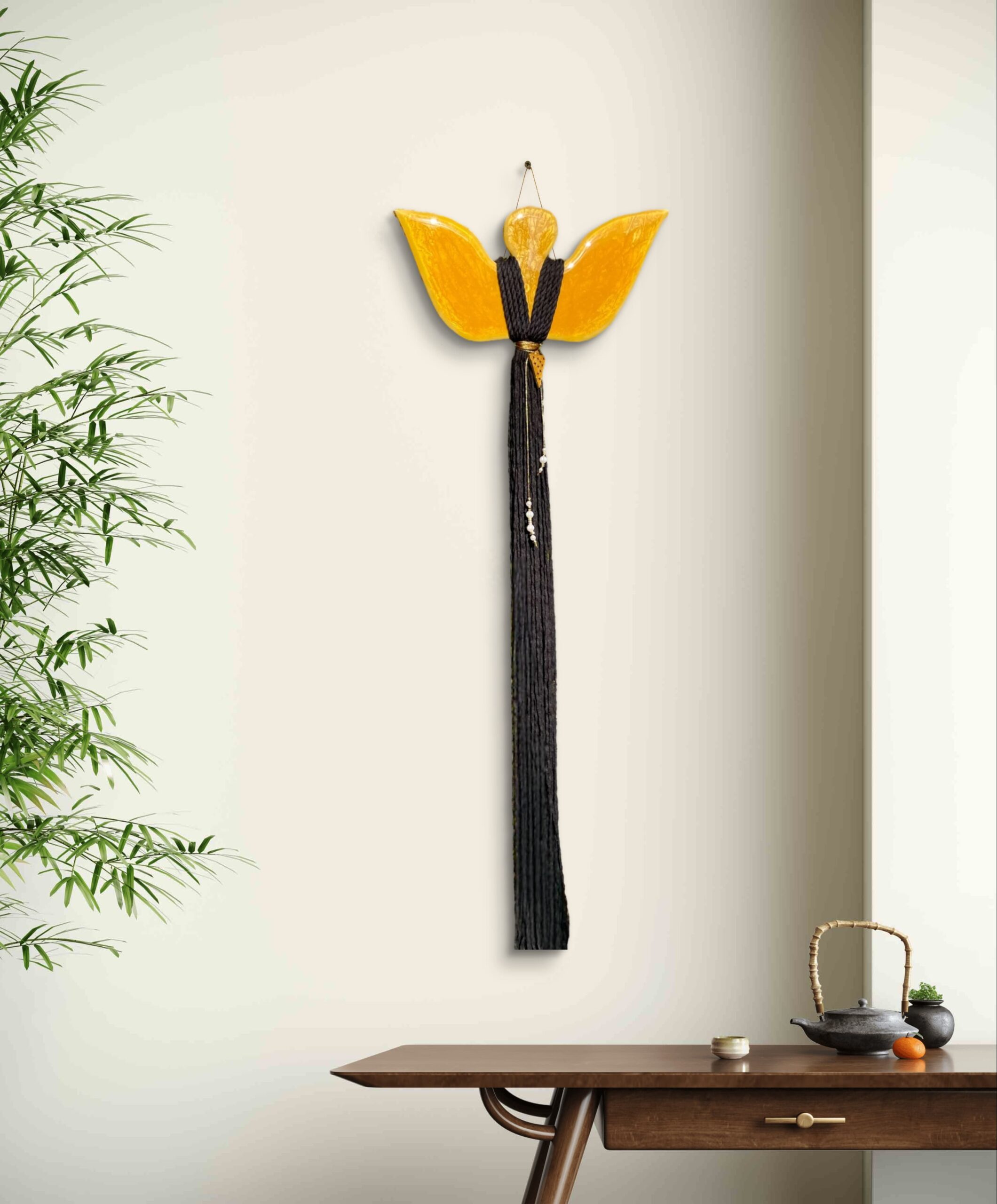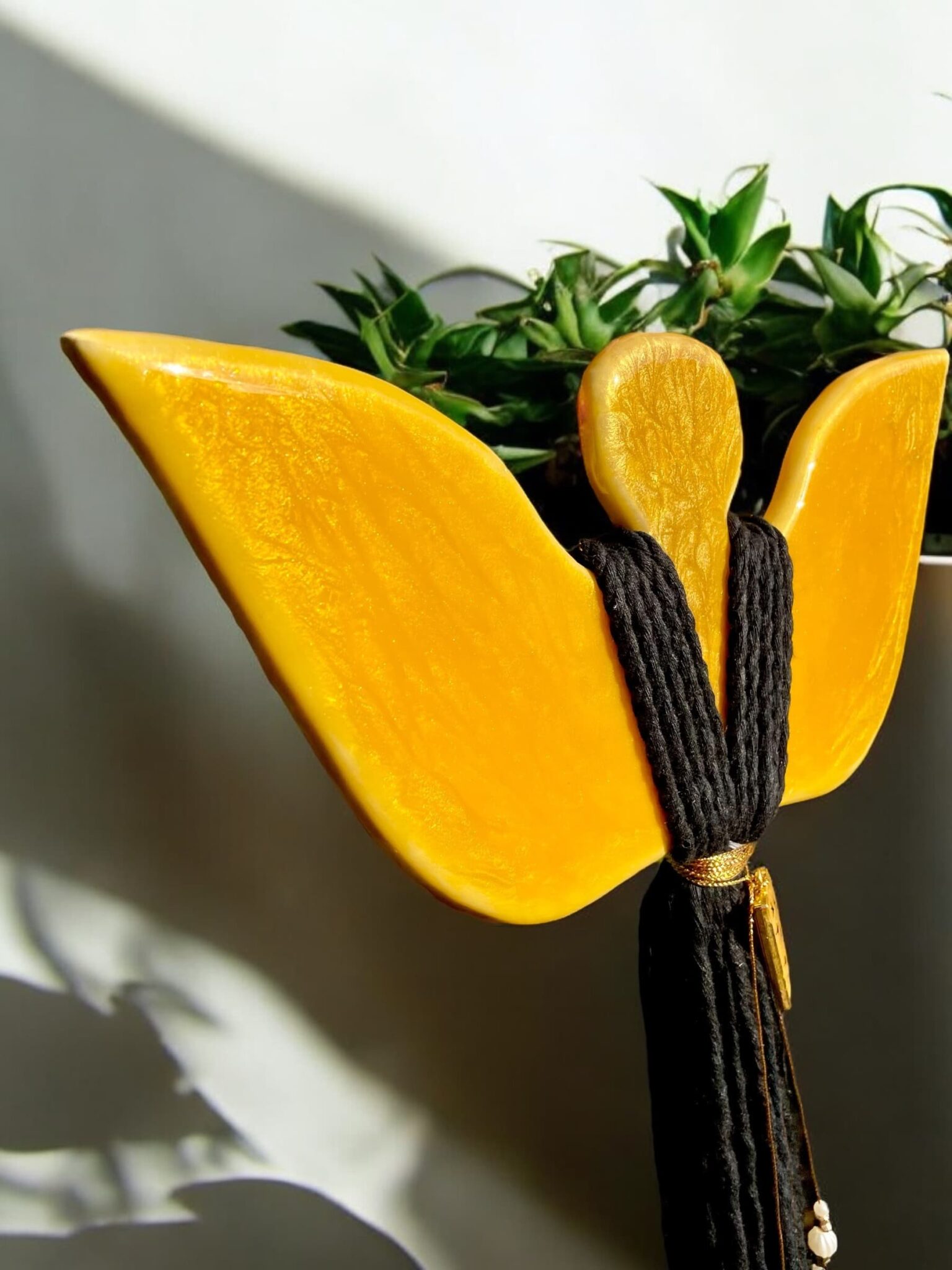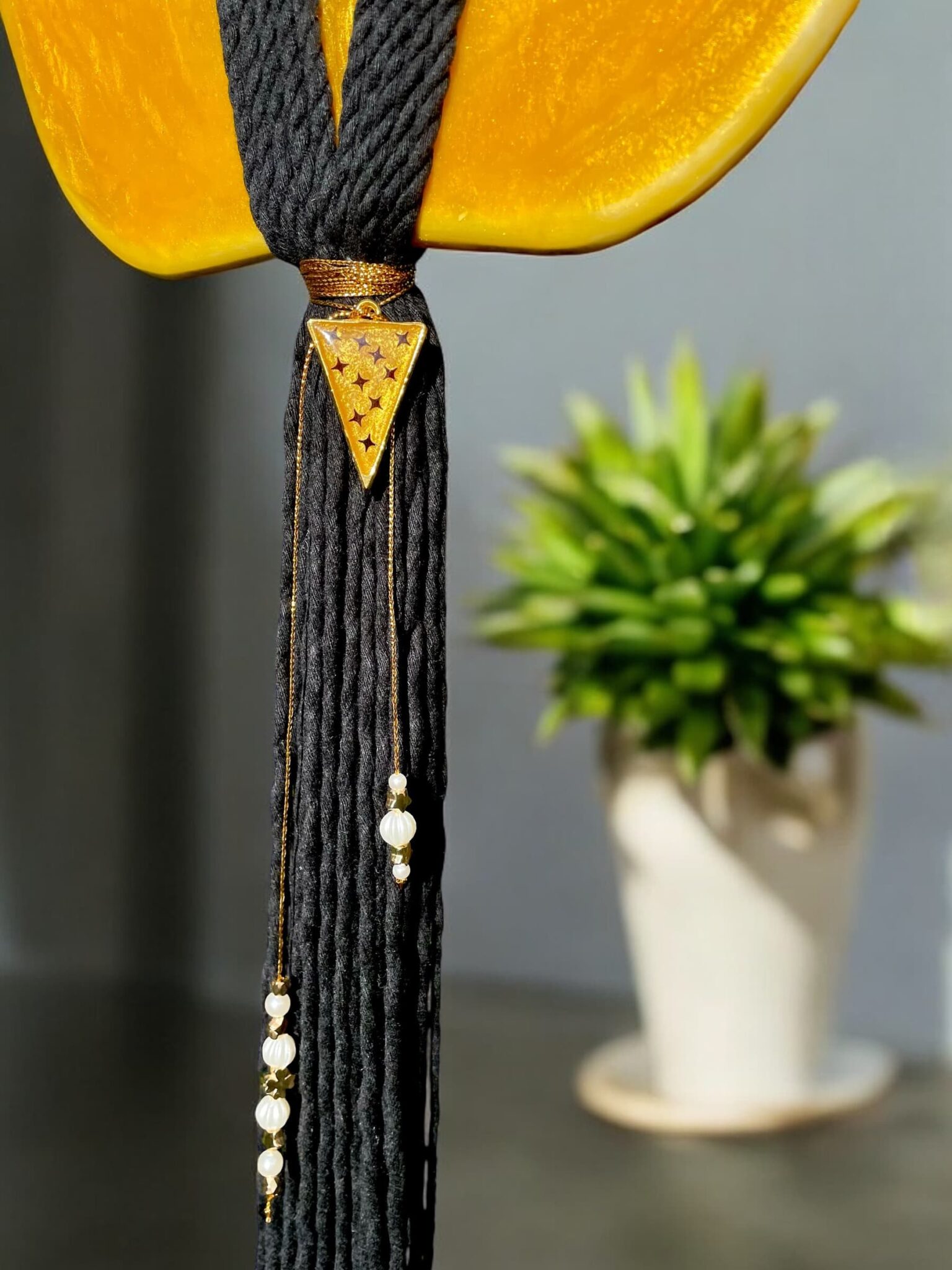 Ten zjawiskowy Anioł zachwyca głębokimi odcieniami złota, które w każdym wnętrzu dodają blasku i elegancji. Dodatkowo, jego biżuteria wykonana z żywicy epoksydowej w kształcie trójkąta, z pięknym złotym kolorem i czarnymi gwiazdkami, sprawia, że staje się jeszcze bardziej wyjątkowy.