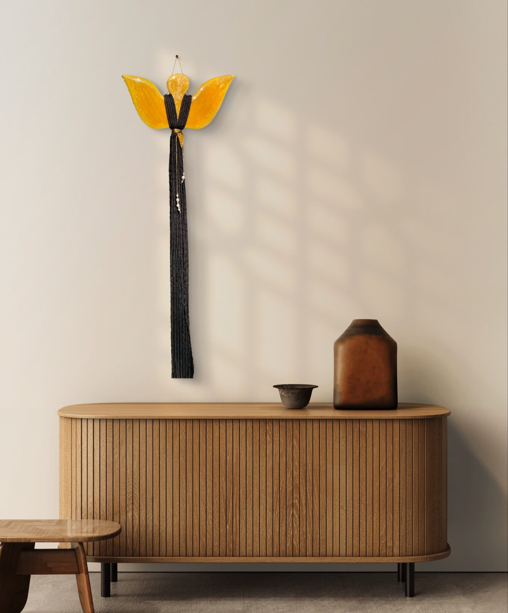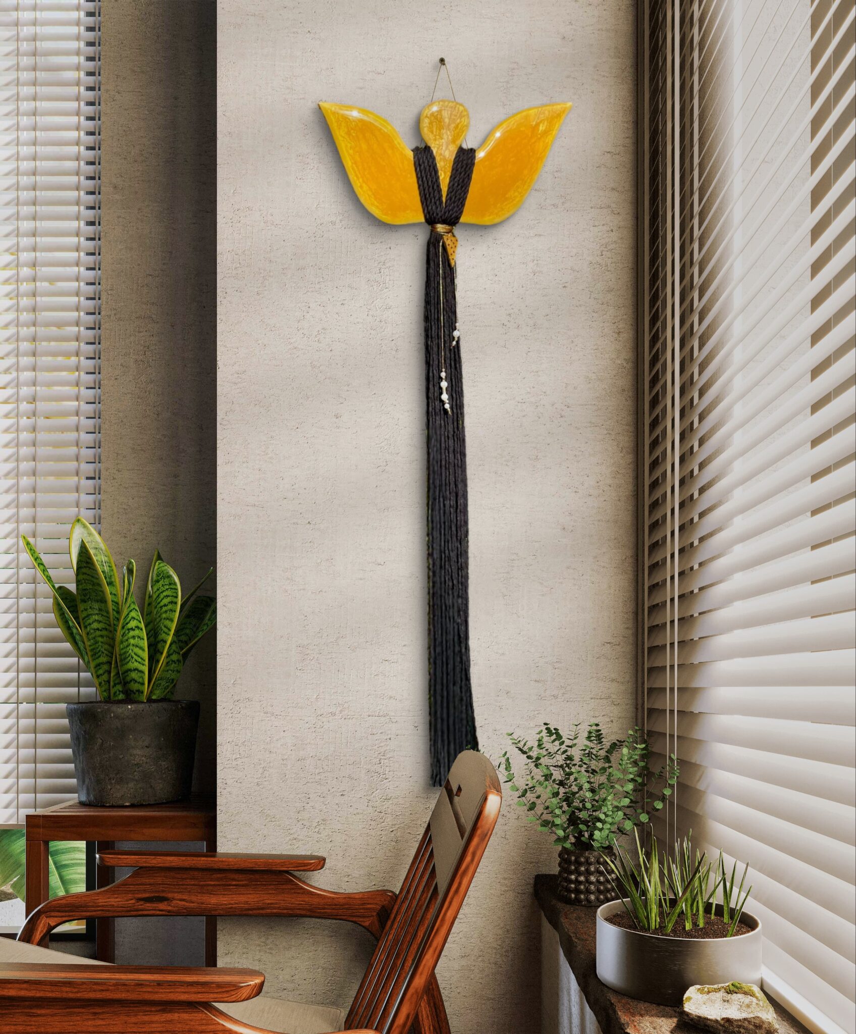 Anioł został ozdobiony wysokiej jakości czarnym sznurkiem makramowym, wykonanym z 100% bawełny z recyklingu, co podkreśla jego ekologiczny charakter. Złoty pasek z zawieszkami w formie gwiazdek i koniczynek, oraz perłowe koraliki, dopełniają całości, tworząc harmonijną kompozycję.