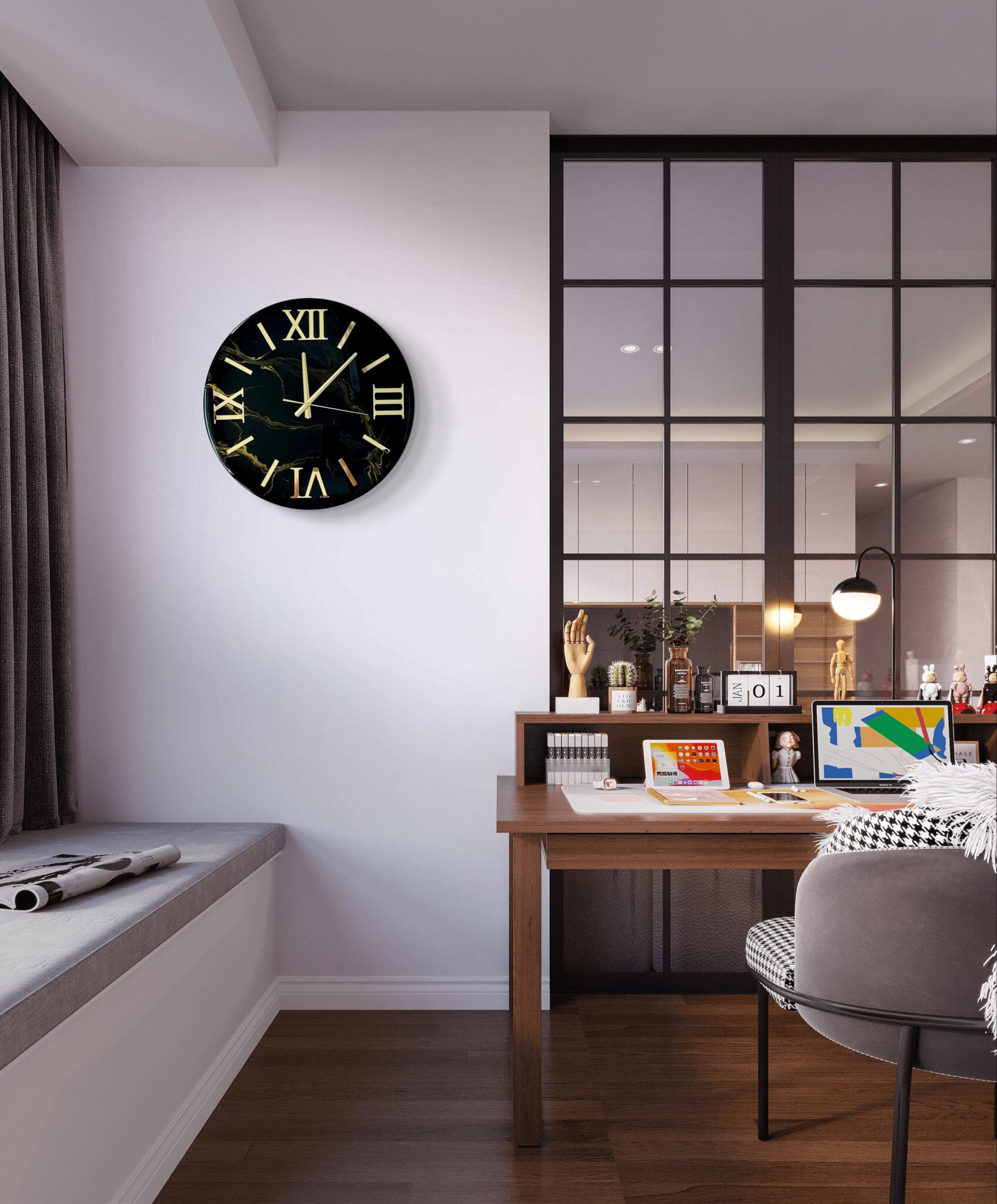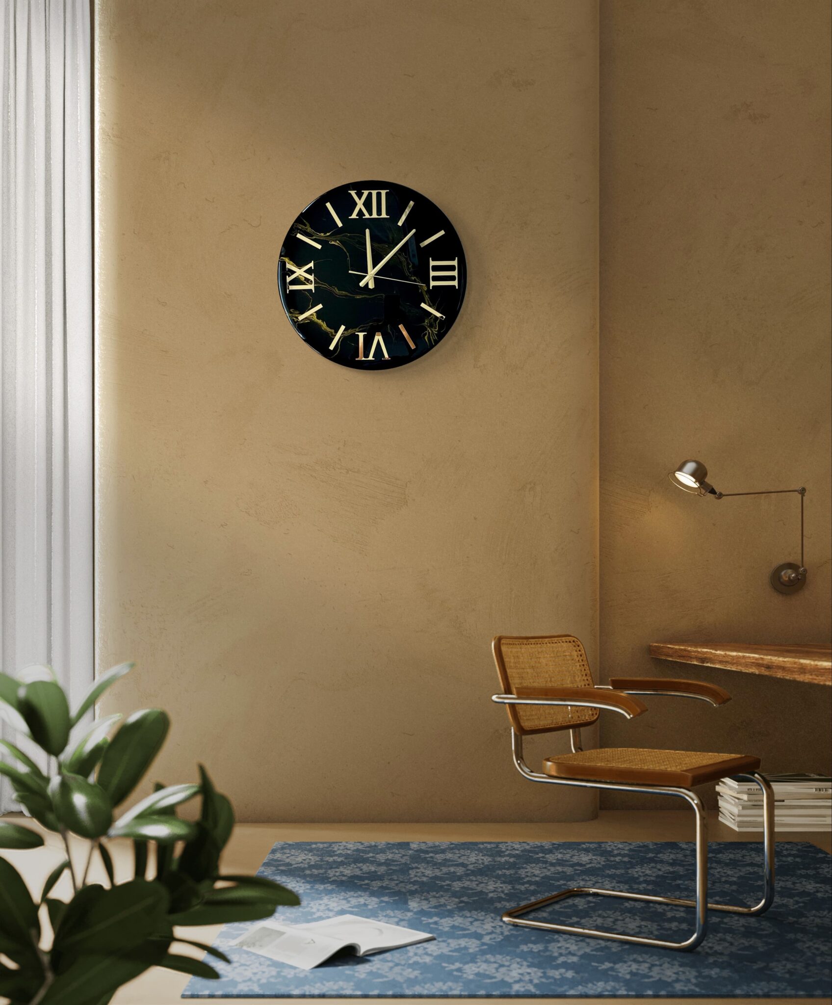 Tarcza zegara zdobiona jest złotymi rzymskimi cyframi oraz eleganckimi złotymi wskazówkami, co sprawia, że zegar nie tylko odmierza czas, ale także stanowi wyjątkową dekorację każdego wnętrza. Z tyłu zegara umieszczony został zlicowany mechanizm, co zapewnia jego bezgłośną pracę, oraz praktyczny uchwyt do powieszenia, umożliwiający łatwe zamontowanie na ścianie.