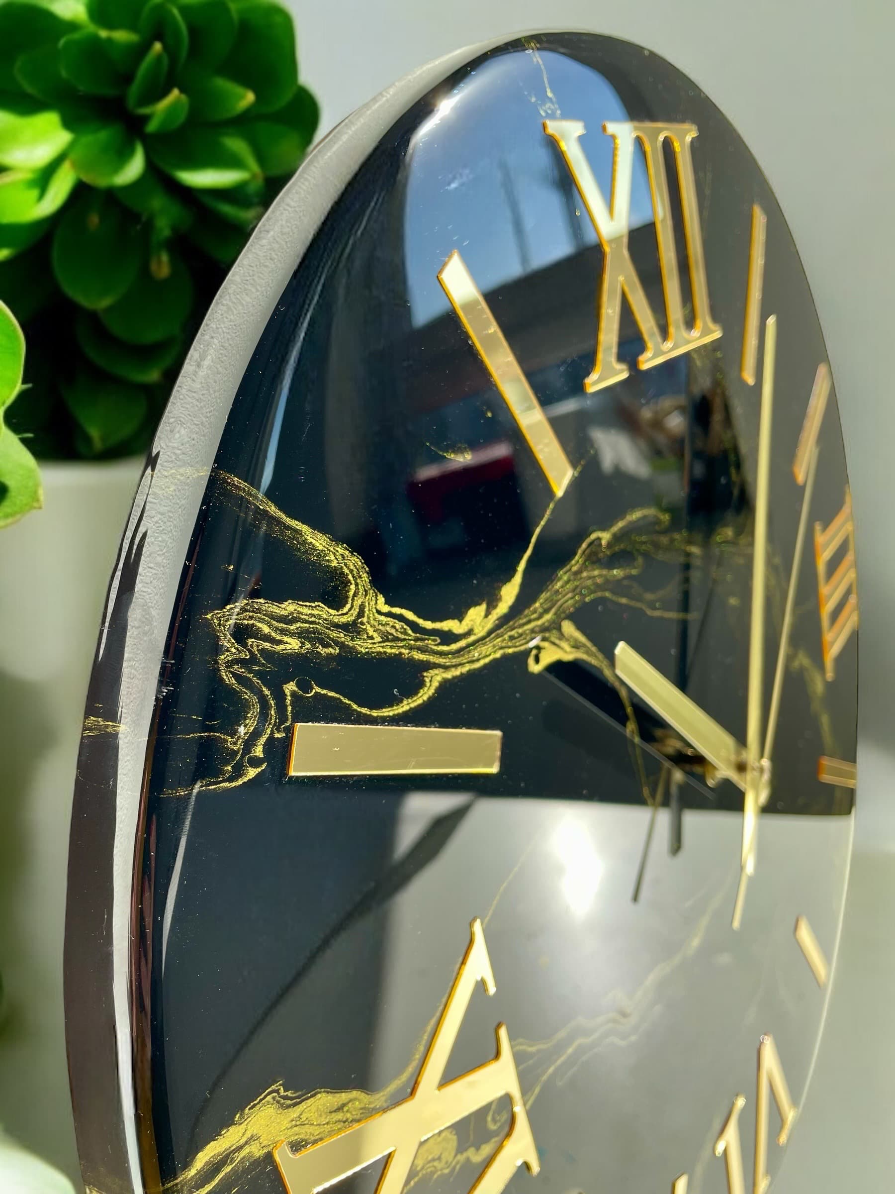 Ten unikalny czasomierz wykonany jest z płyty MDF o grubości 18 mm, która została starannie zalana elegancką żywicą epoksydową w głębokim czarnym kolorze, akcentowaną subtelnymi żyłkami w odcieniu złotym.