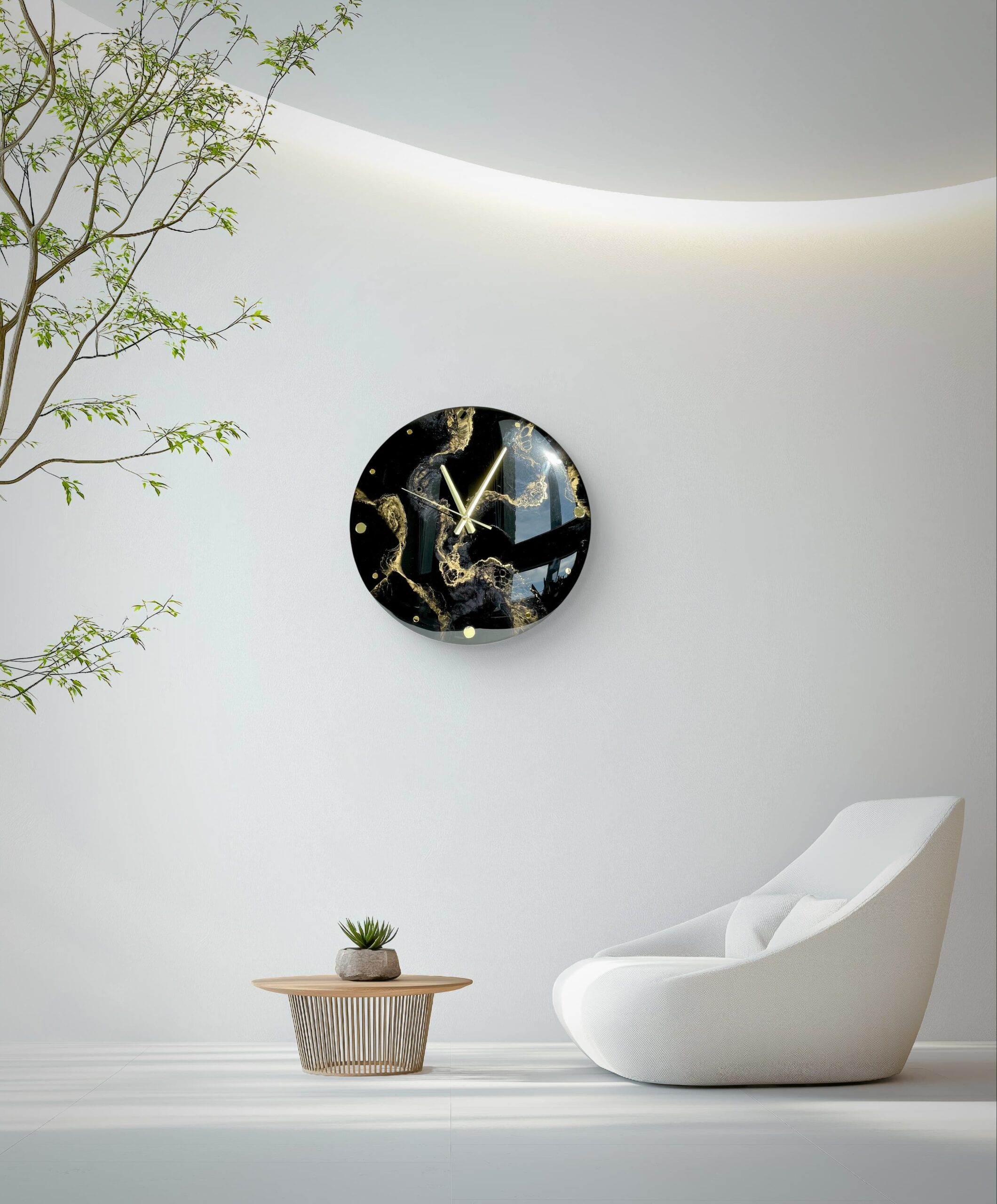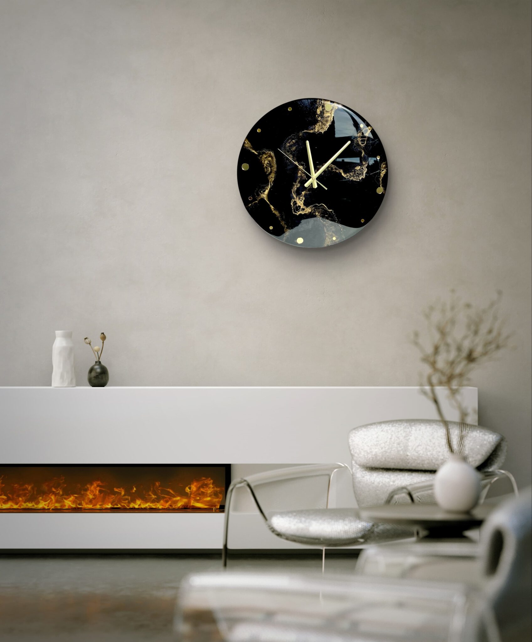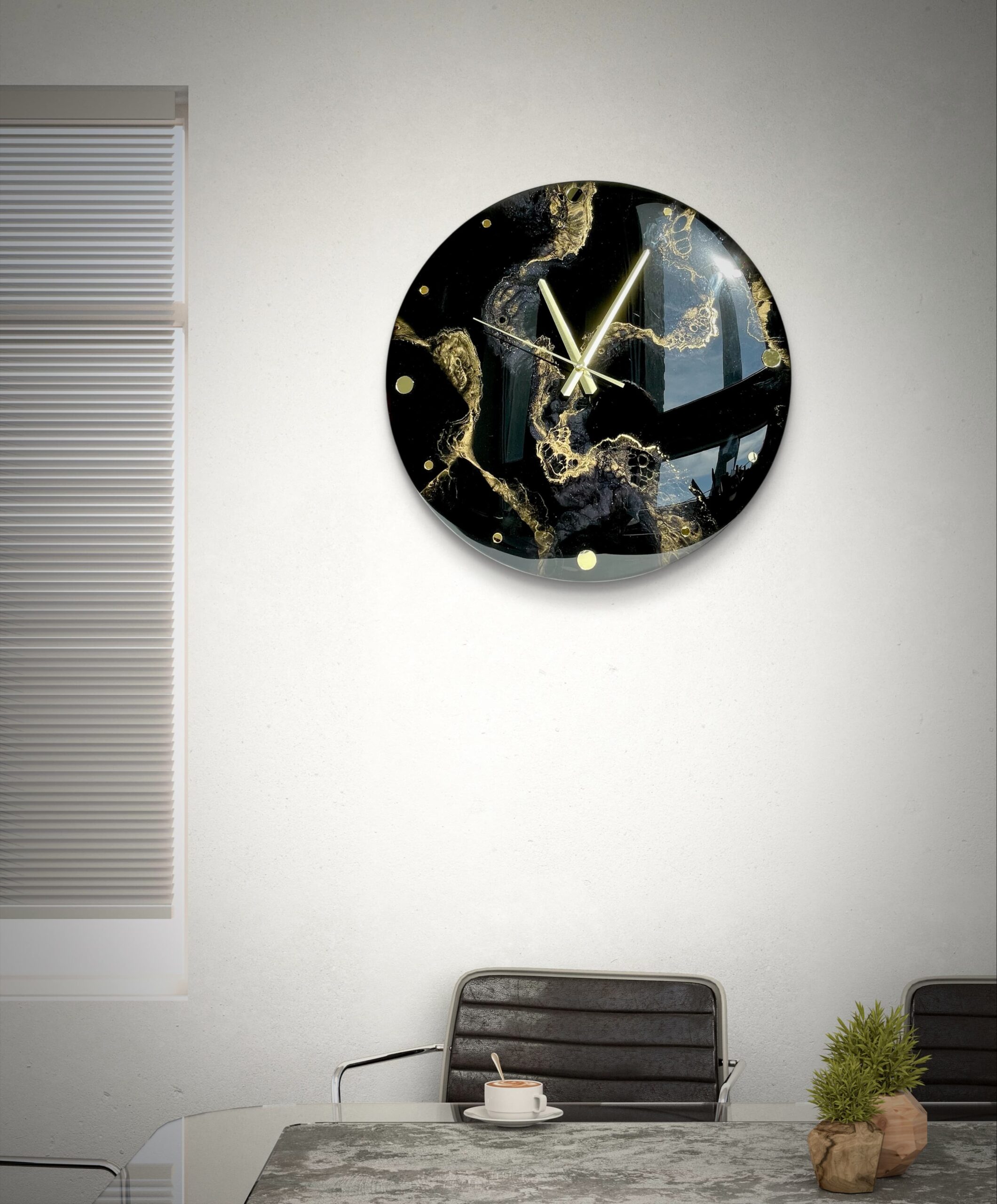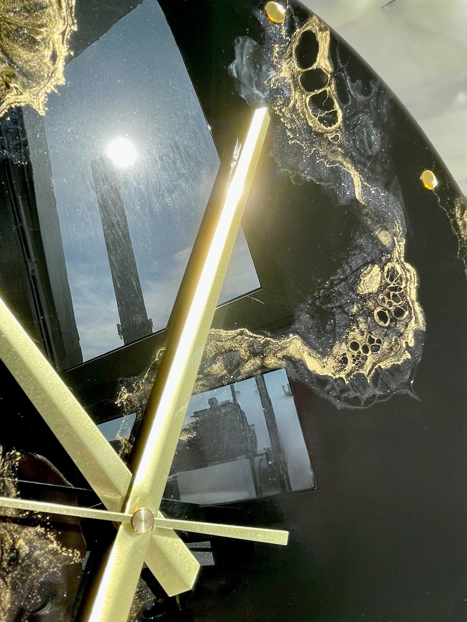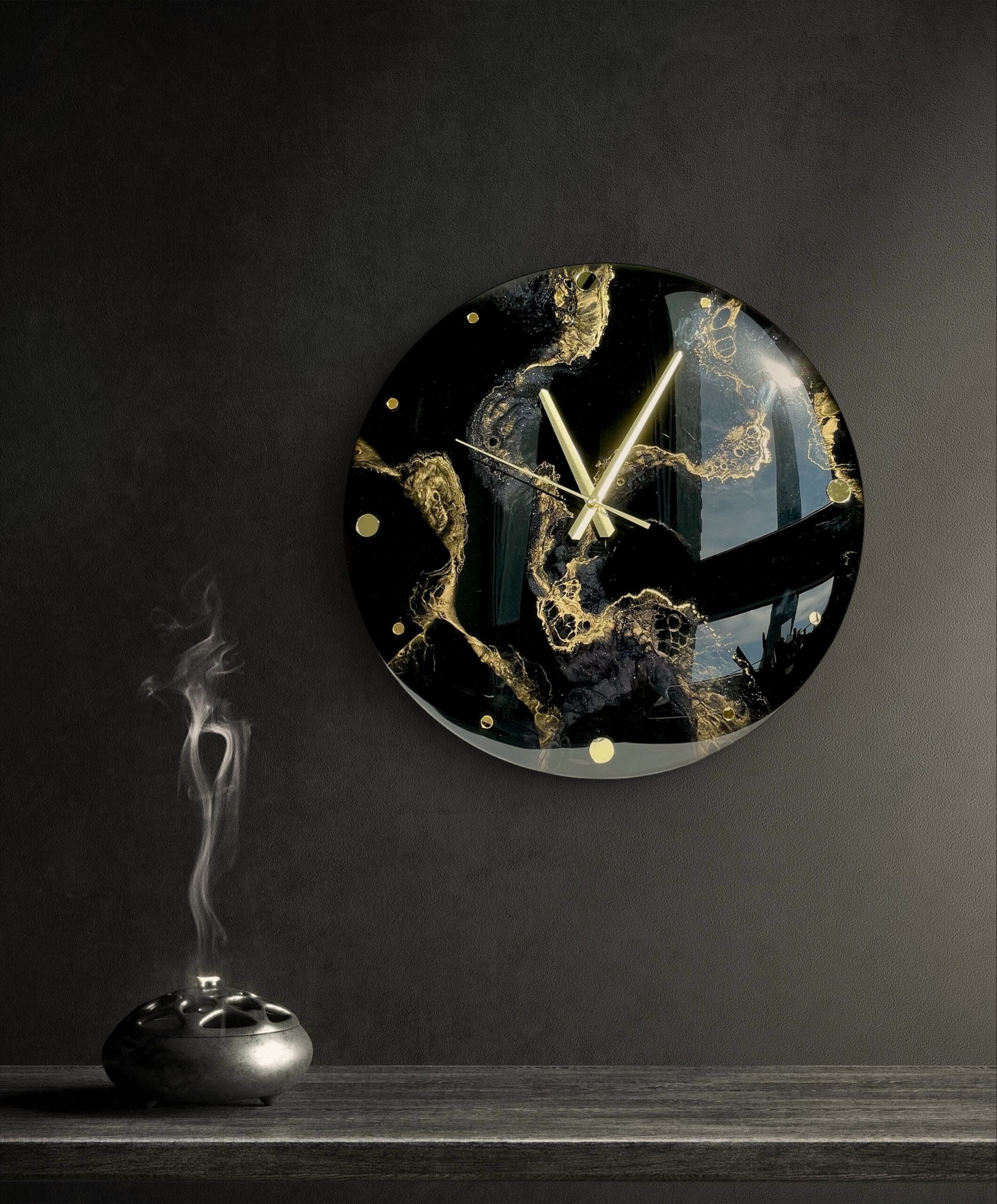 Indeksy godzinowe, wykonane z lustra w odcieniu złota, podkreślają luksusowy charakter zegara, a złote wskazówki oraz sekundnik dodają mu niepowtarzalnego blasku. Powierzchnia zegara jest zabezpieczona dodatkową warstwą bezbarwnej żywicy epoksydowej, co zapewnia nie tylko trwałość, ale także odporność na promieniowanie UV, chroniąc go przed uszkodzeniami.