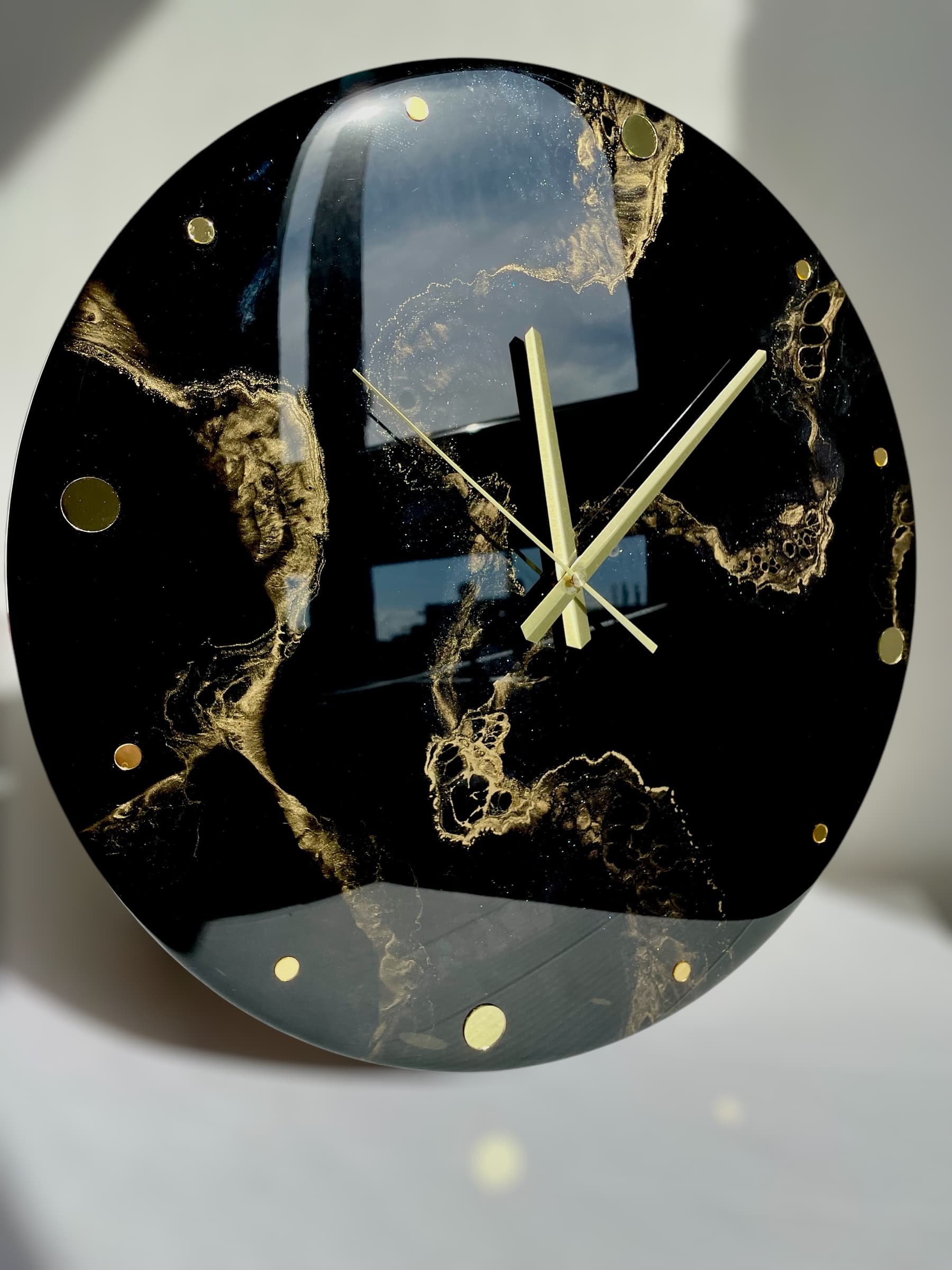 Odkryj niepowtarzalny styl w swoim wnętrzu z moim eleganckim zegarem z żywicy epoksydowej o średnicy 40 cm. Ten wyjątkowy czasomierz łączy w sobie głębię czarnego koloru z subtelnymi akcentami czarnej perły oraz lśniącym złotem, tworząc efektowną kompozycję, która przyciąga wzrok.