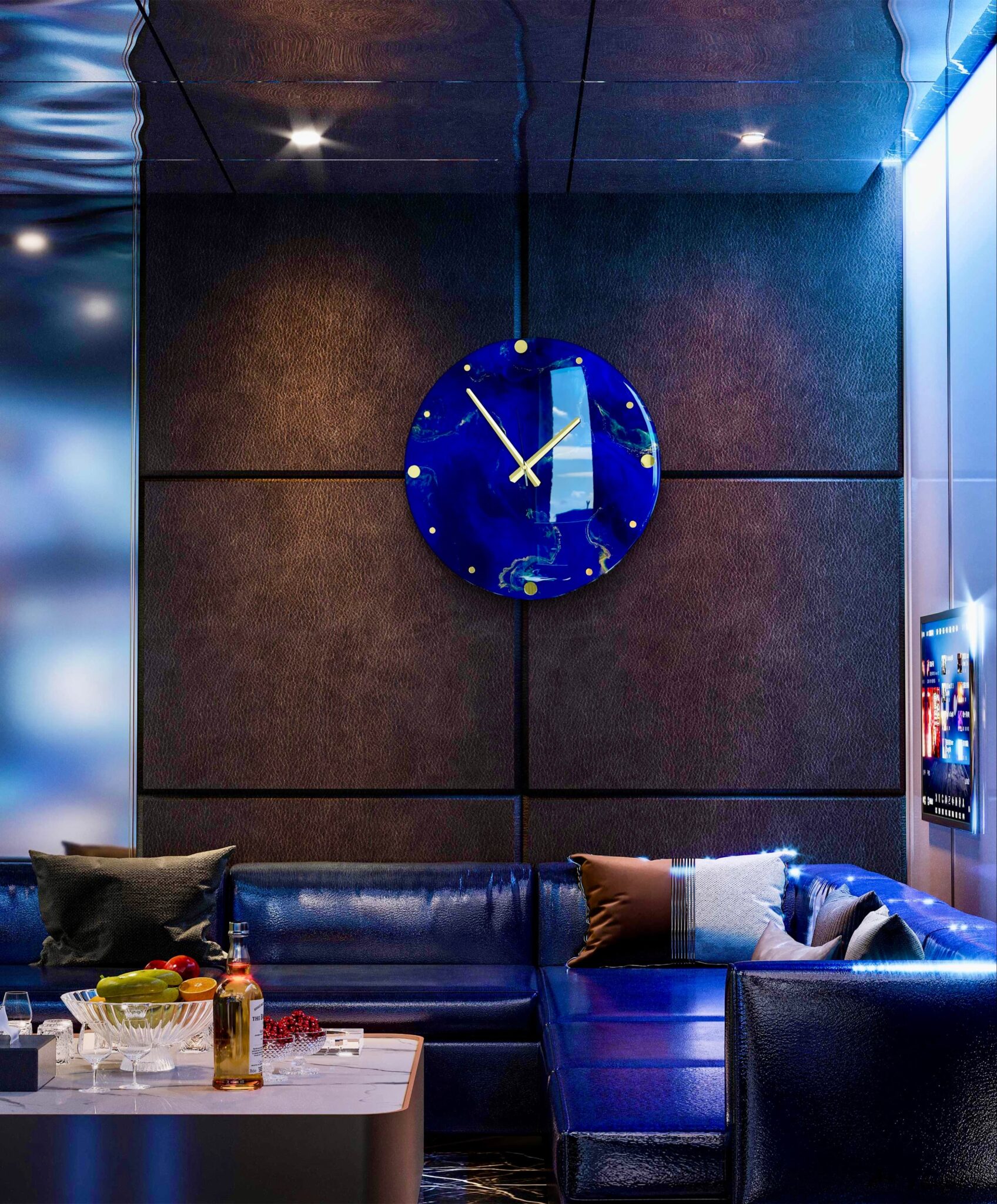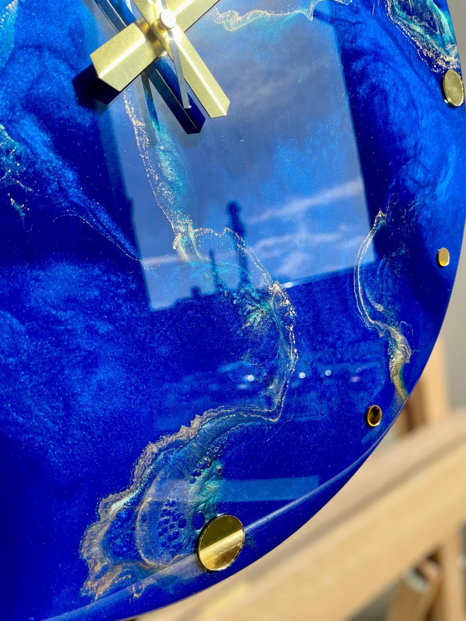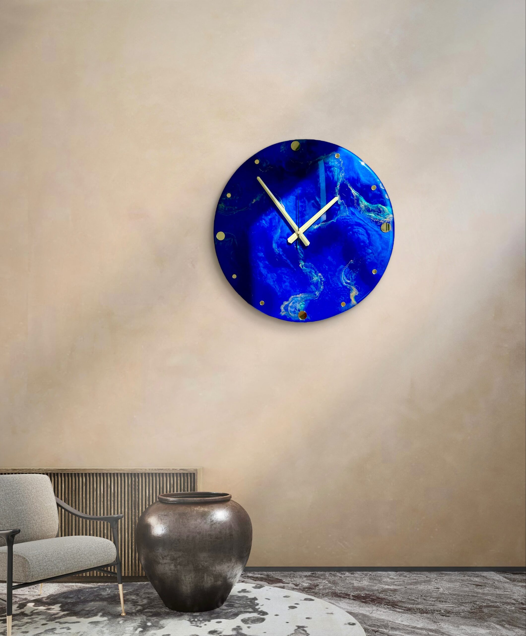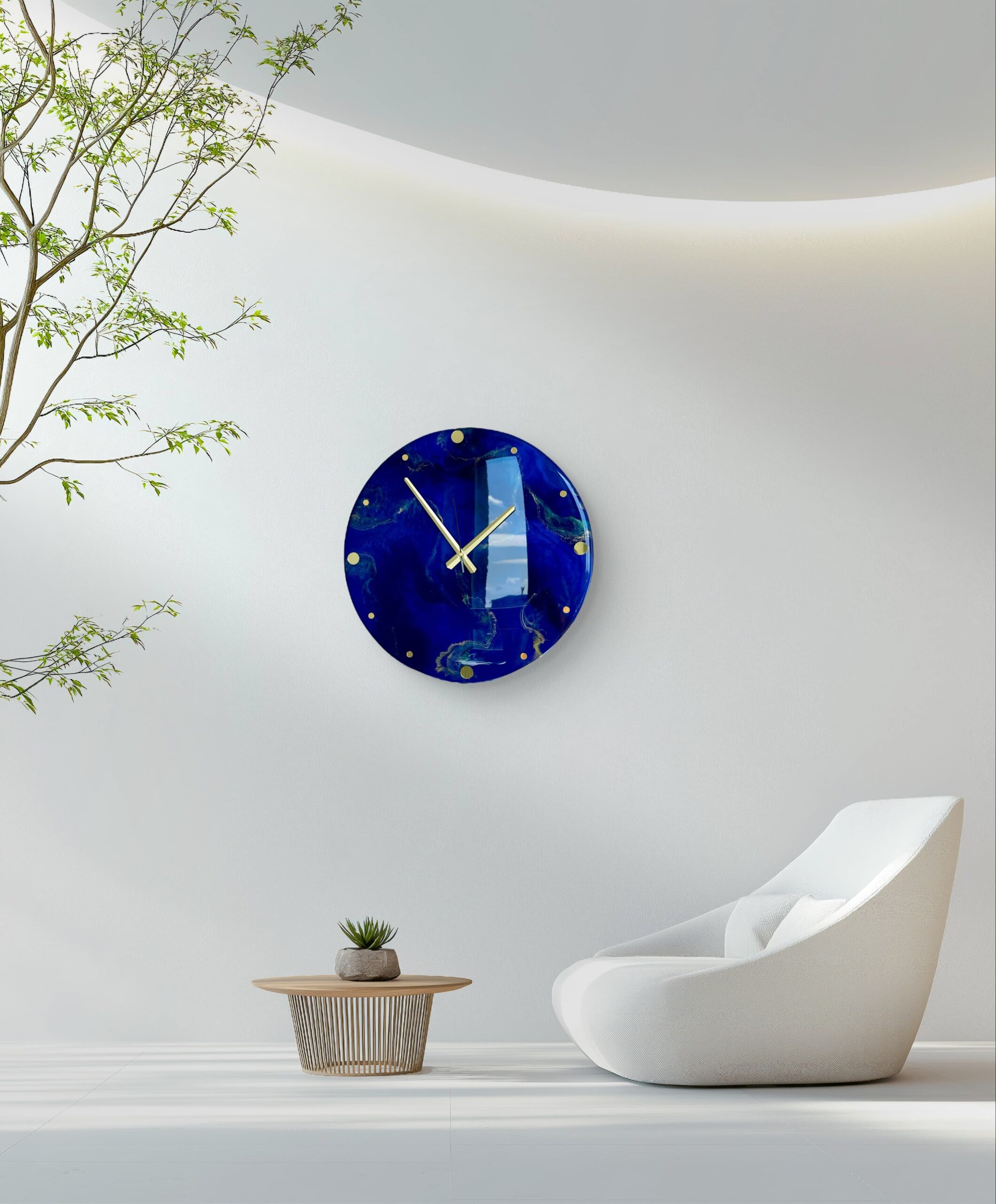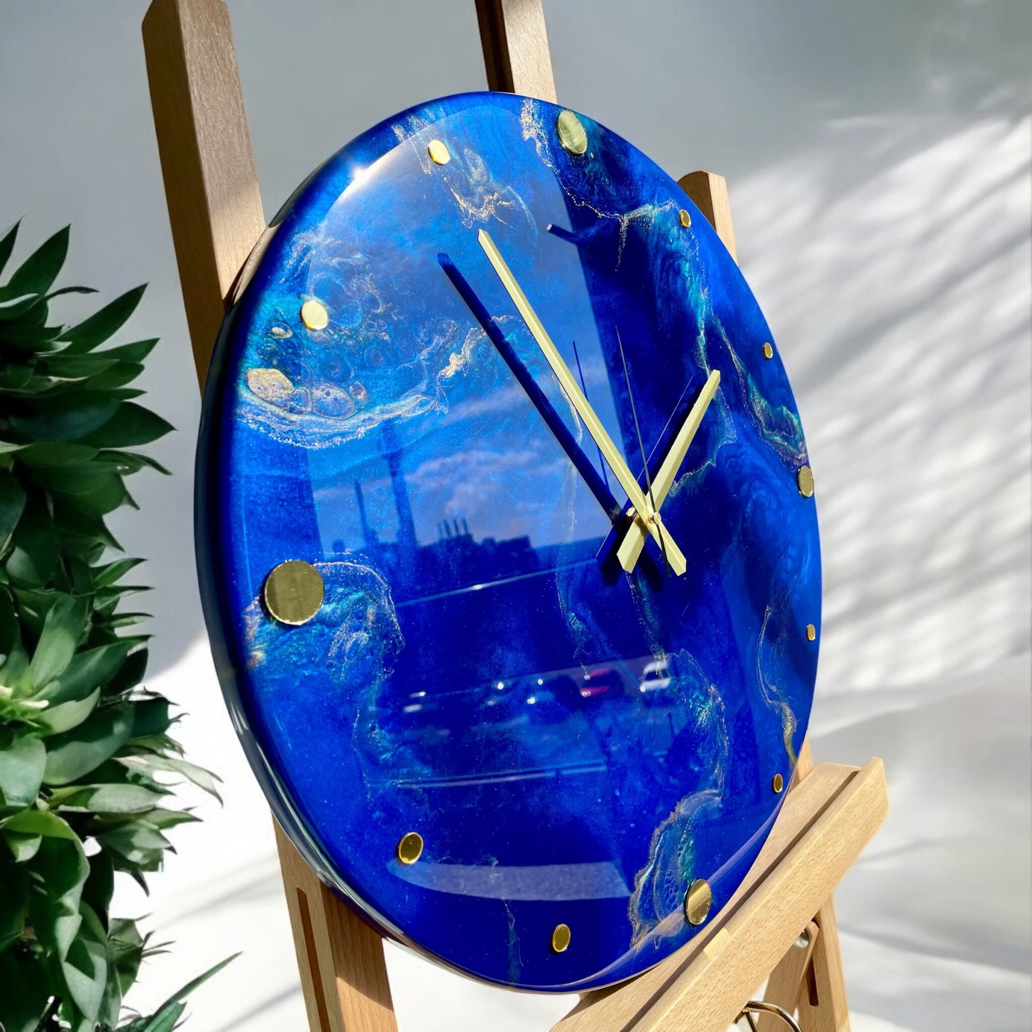 Granatowy Zegar Ścienny z Żywicy Epoksydowej – Nowoczesny Design z Złotymi Akcentami