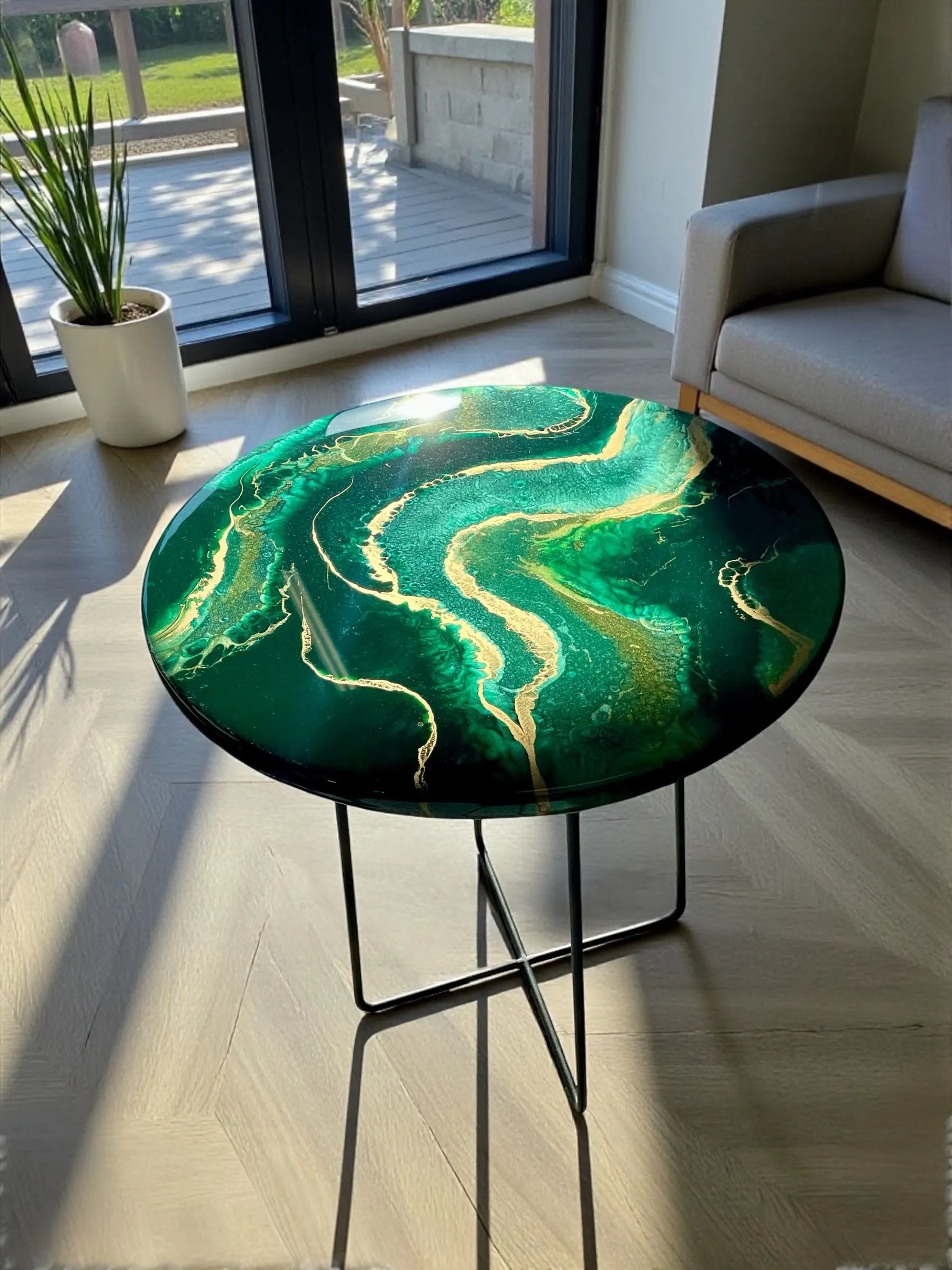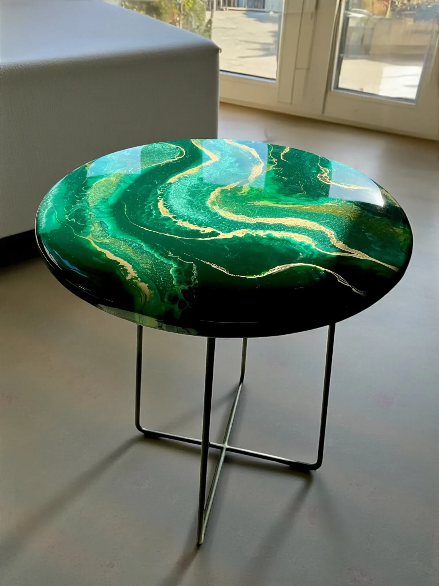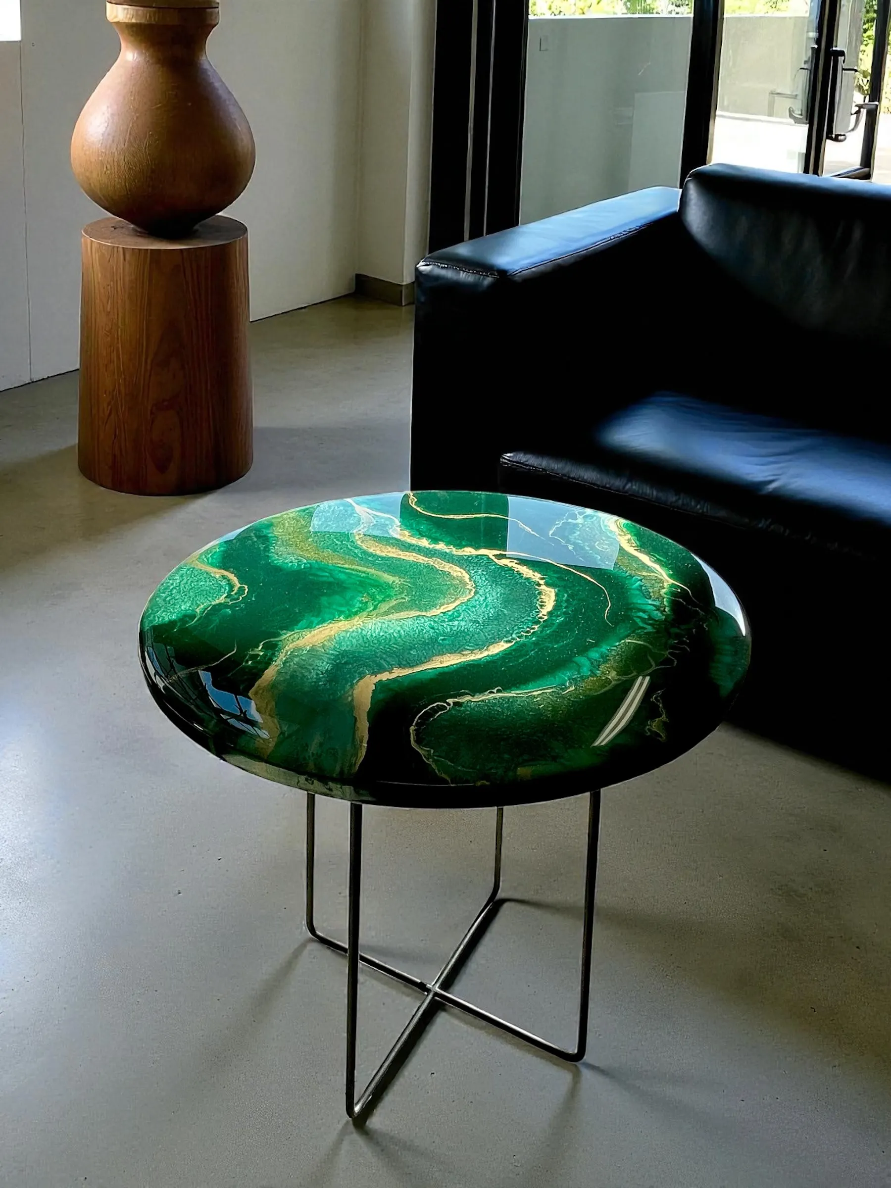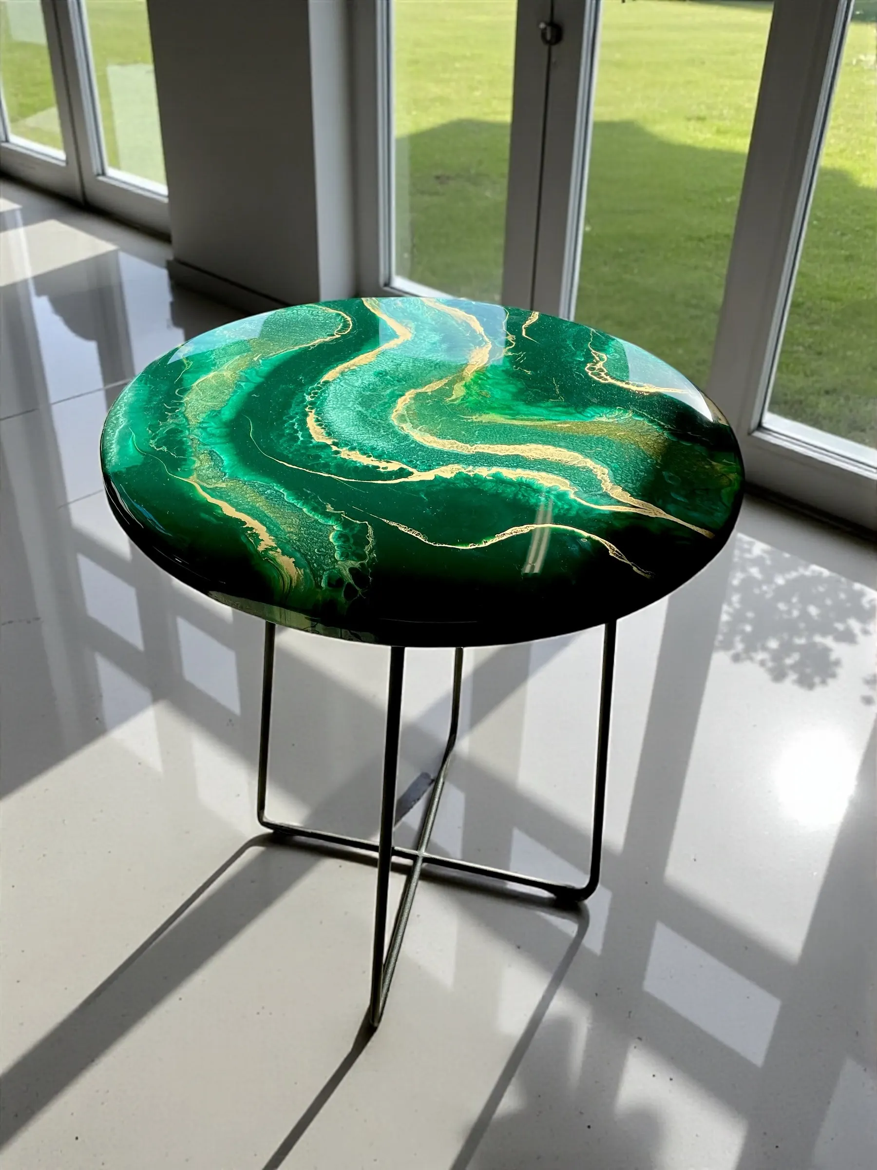Dodaj wyrazisty akcent do swojego wnętrza dzięki naszemu unikalnemu stolikowi kawowemu o średnicy 50 cm. Blat wykonany z solidnej płyty MDF (grubość 18 mm), ręcznie zalany żywicą epoksydową w odcieniach głębokiej butelkowej zieleni z eleganckimi złotymi akcentami. Całość zabezpieczona dodatkową warstwą bezbarwnej żywicy epoksydowej, co zapewnia wysoką odporność na zarysowania, wgniecenia, promieniowanie UV oraz codzienne użytkowanie.