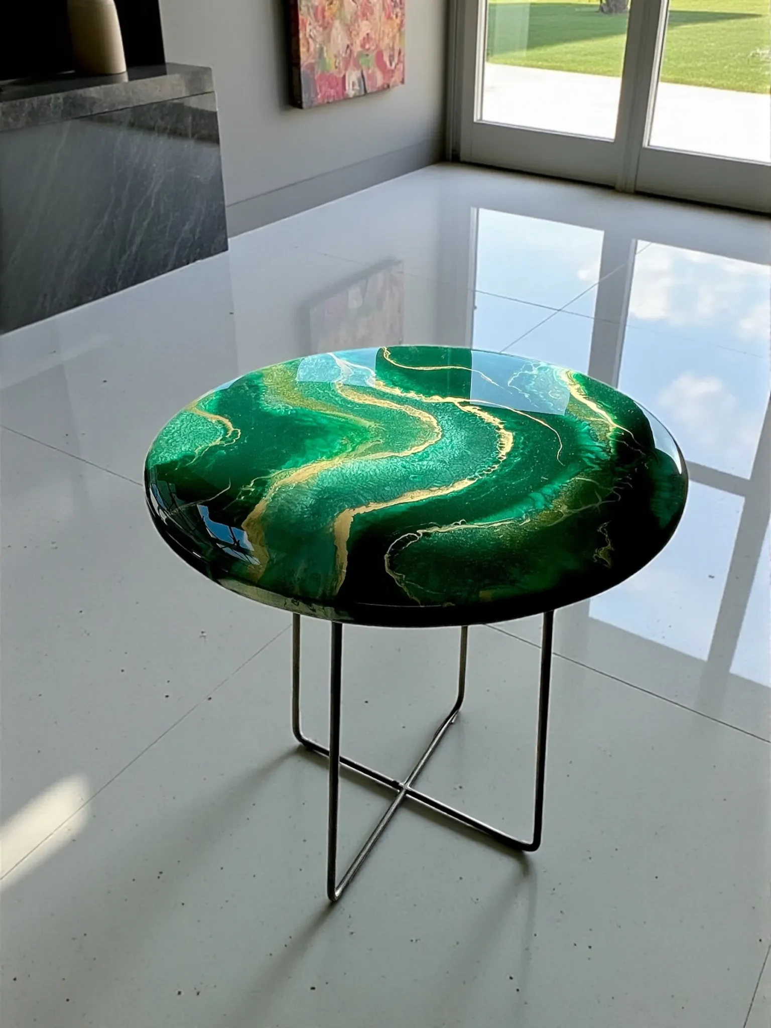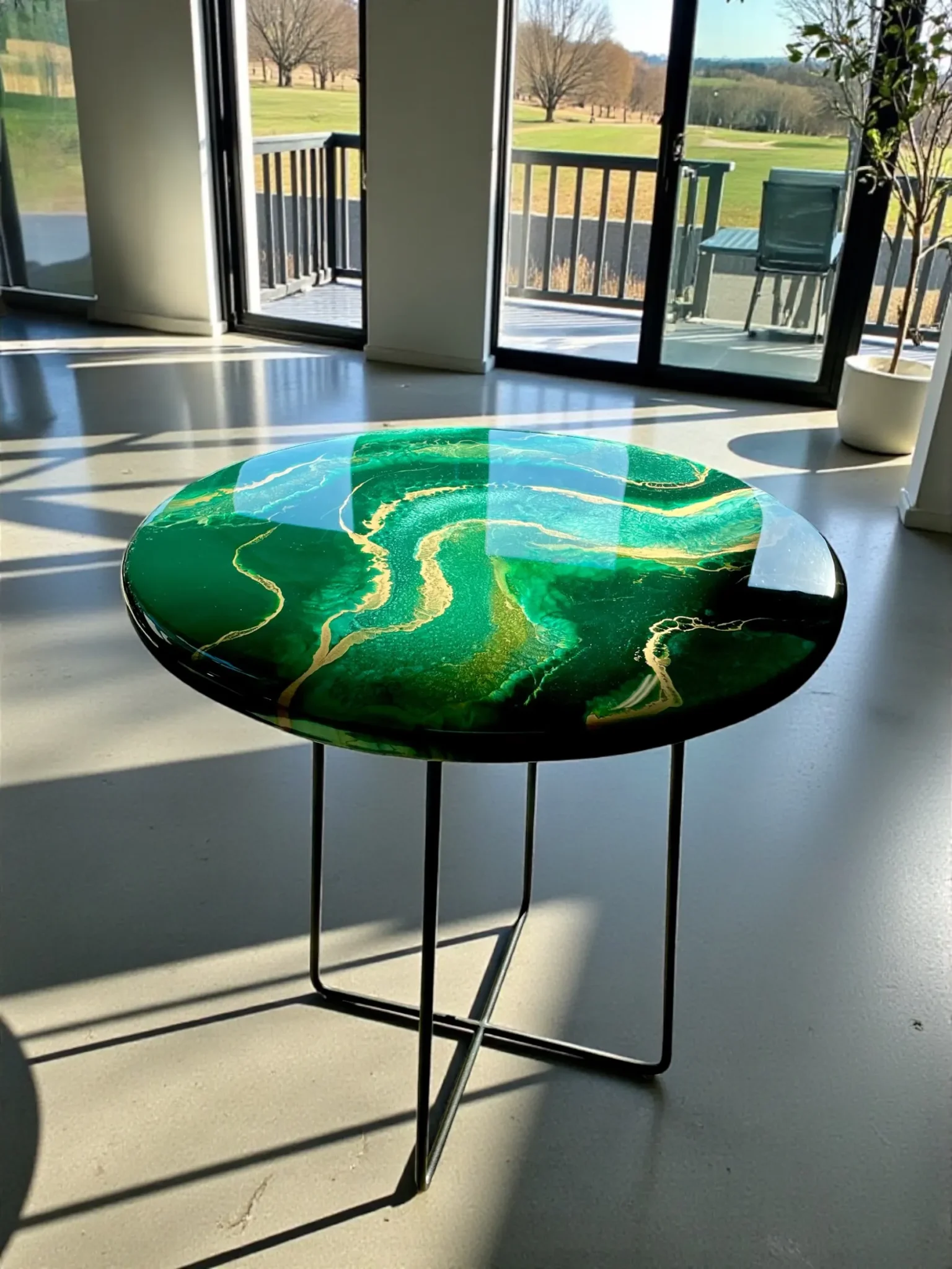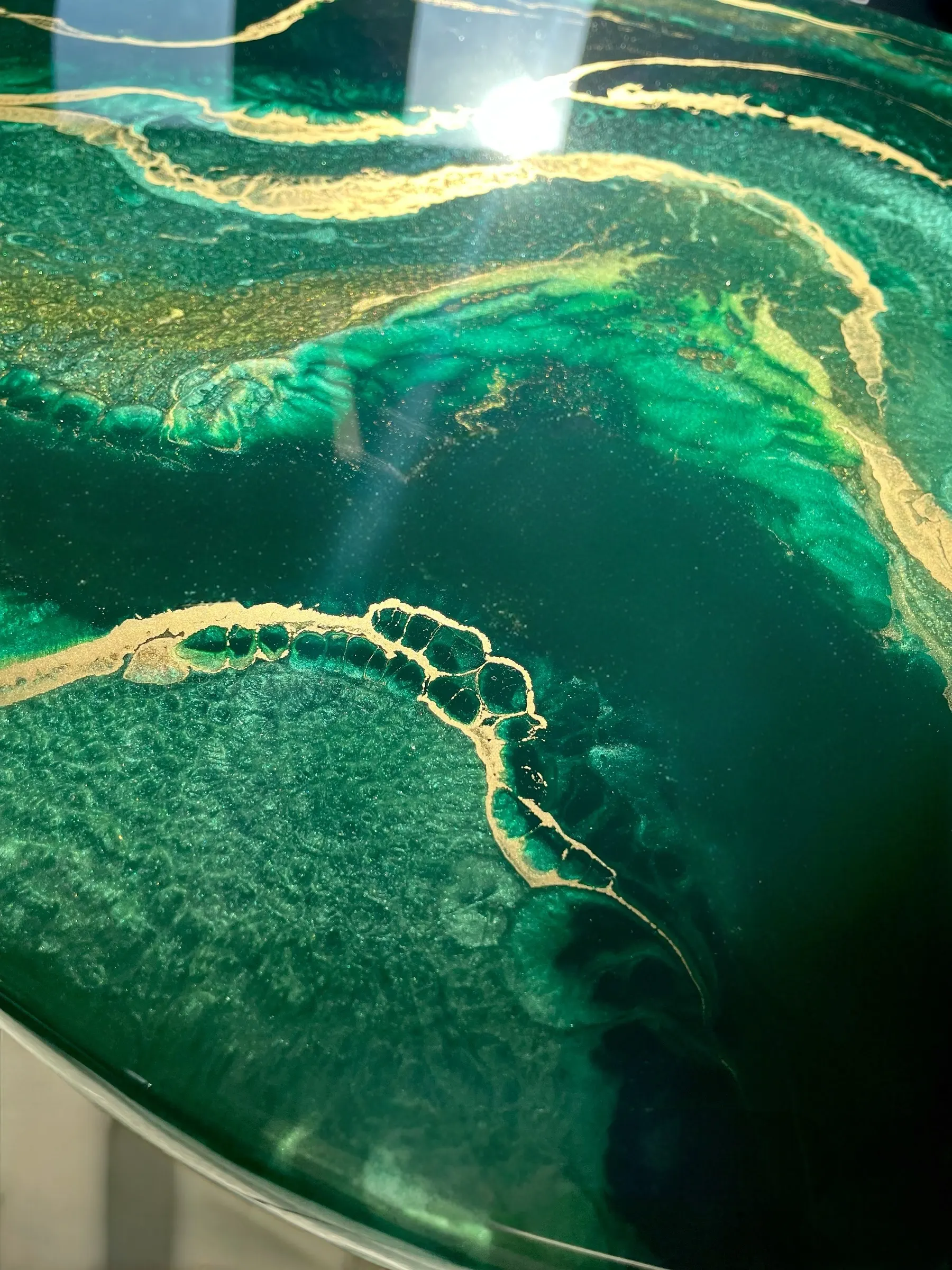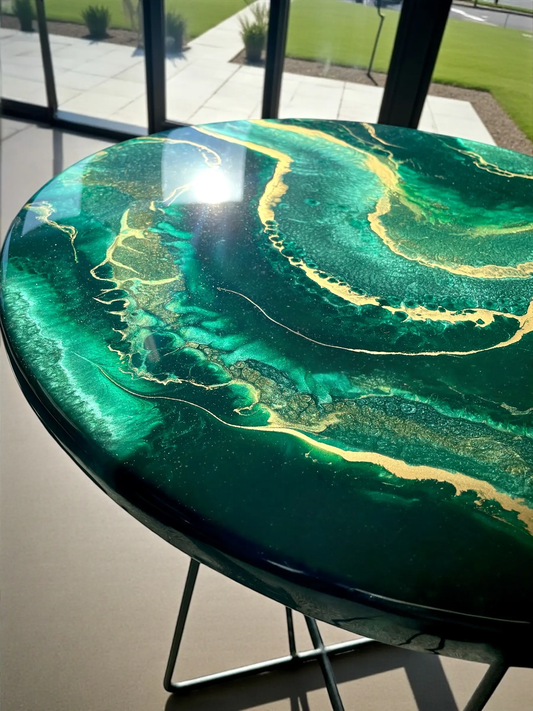 Dodaj wyrazisty akcent do swojego wnętrza dzięki naszemu unikalnemu stolikowi kawowemu o średnicy 50 cm. Blat wykonany z solidnej płyty MDF (grubość 18 mm), ręcznie zalany żywicą epoksydową w odcieniach głębokiej butelkowej zieleni z eleganckimi złotymi akcentami. Całość zabezpieczona dodatkową warstwą bezbarwnej żywicy epoksydowej, co zapewnia wysoką odporność na zarysowania, wgniecenia, promieniowanie UV oraz codzienne użytkowanie.