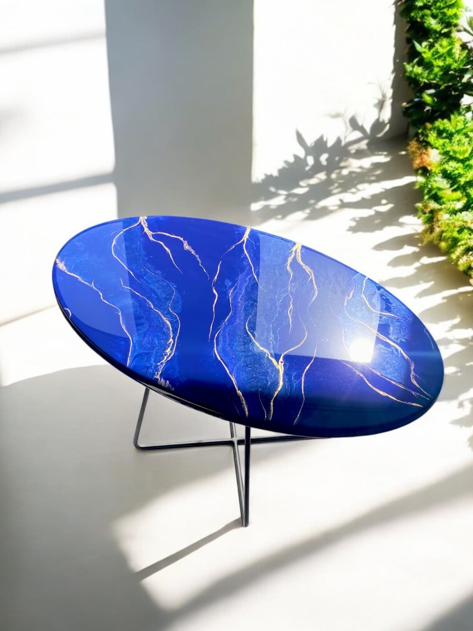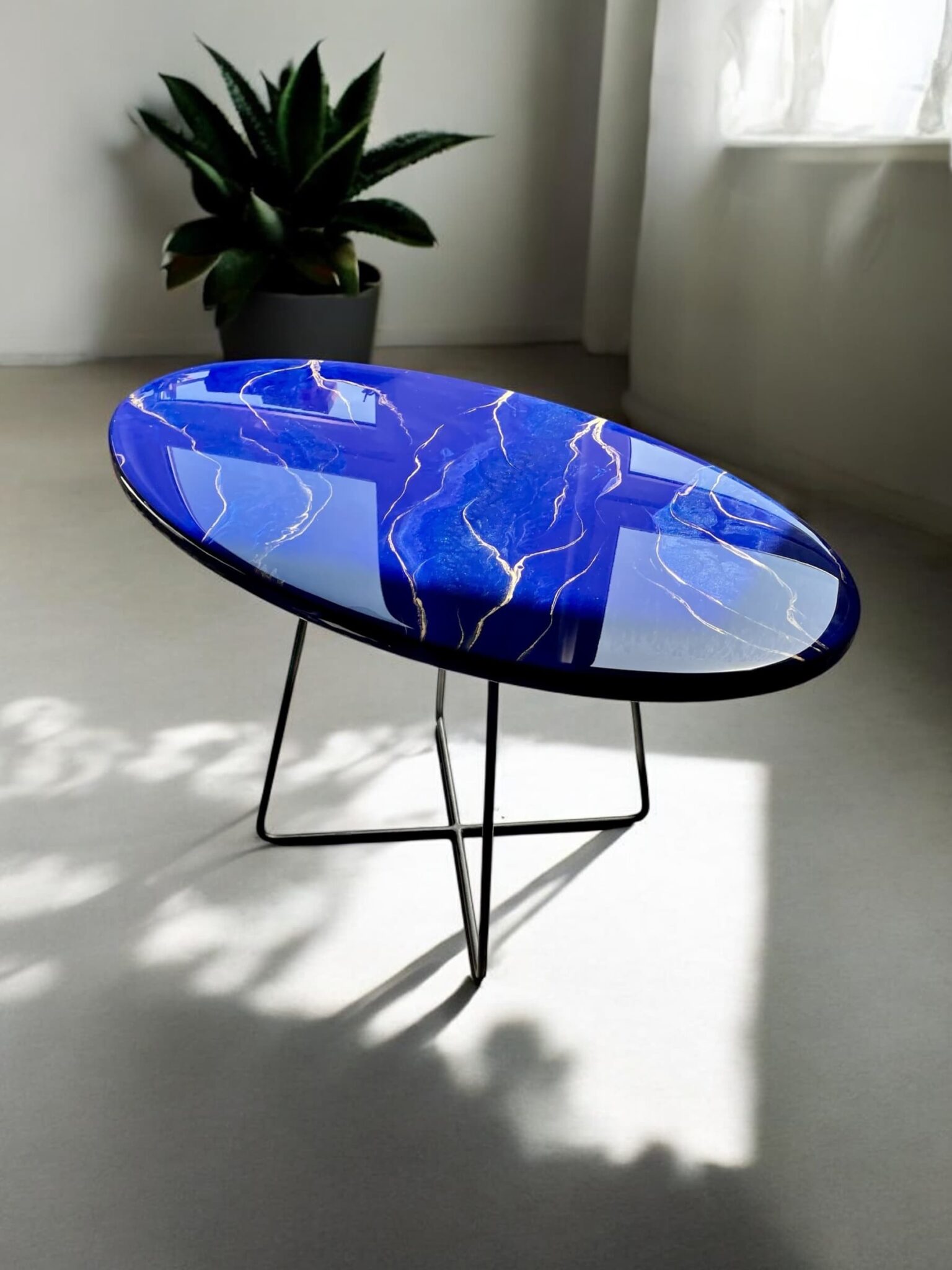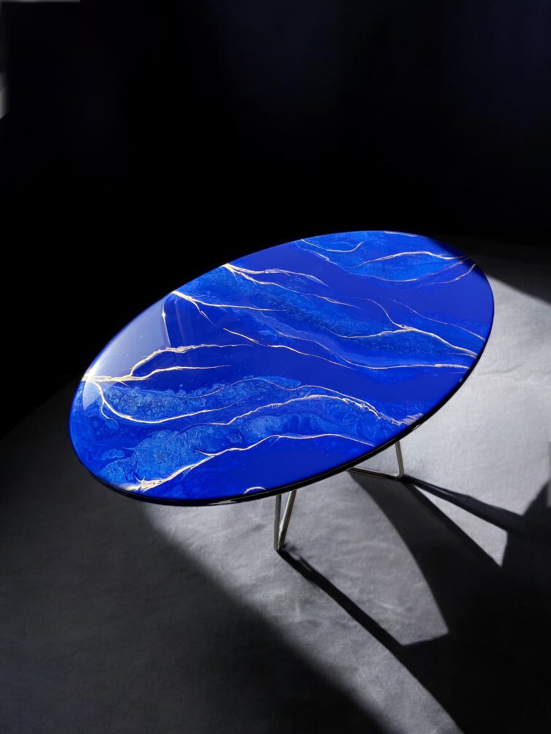Odkryj unikalny stolik, który wniesie do Twojego wnętrza elegancję i nowoczesność! Mój ręcznie wykonany stolik z żywicy epoksydowej to prawdziwe dzieło sztuki, które harmonijnie łączy w sobie piękne odcienie szafiru z subtelnymi akcentami złota.