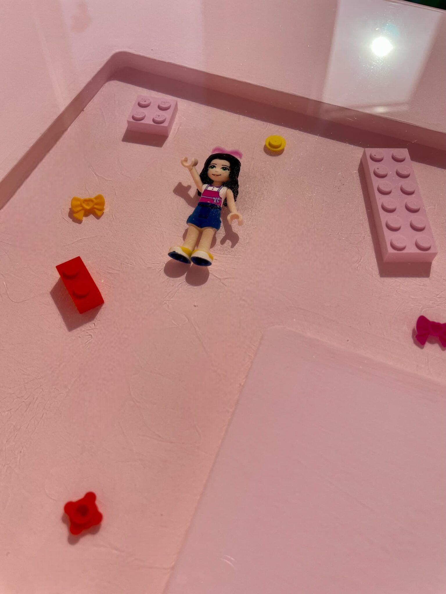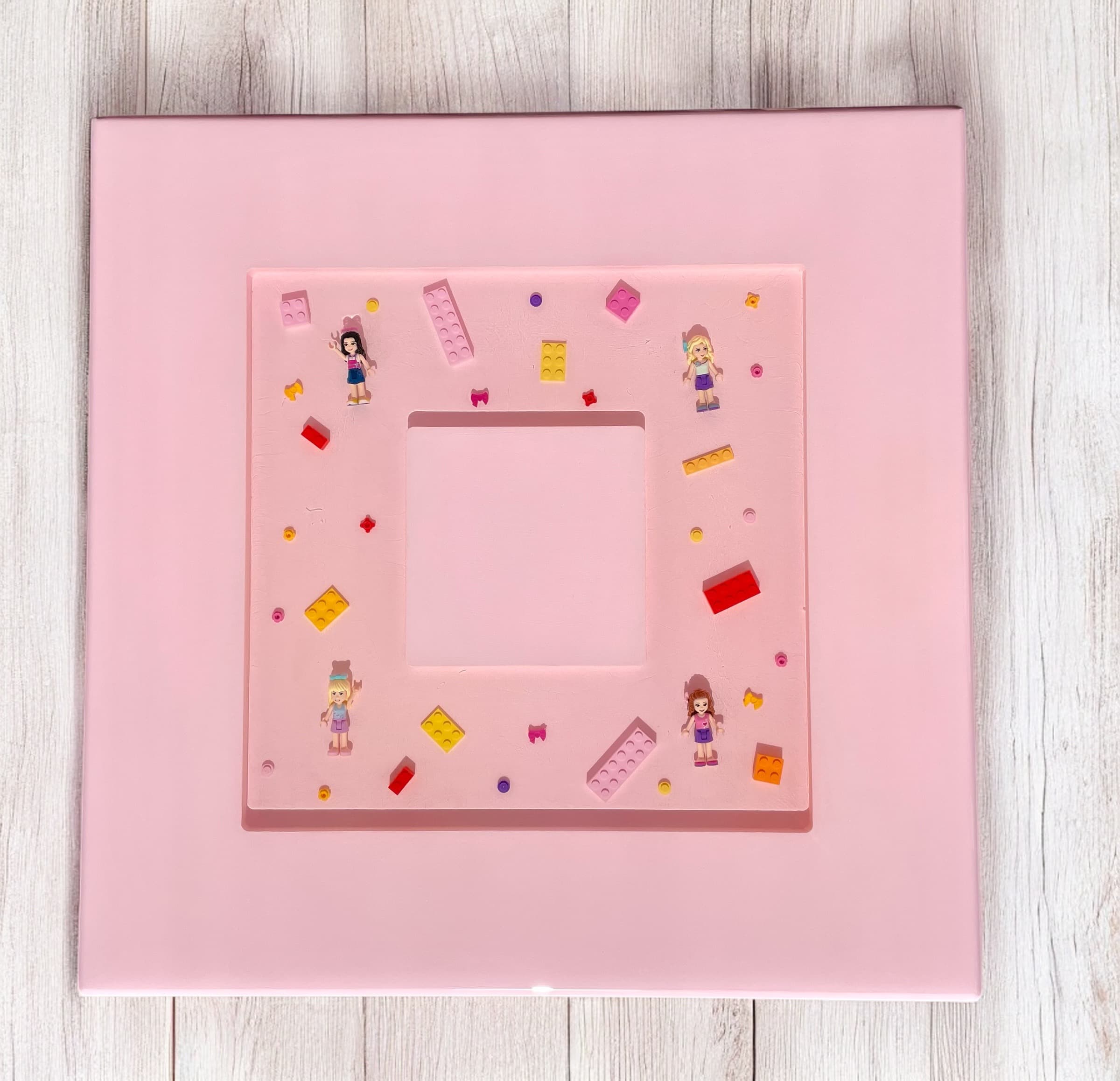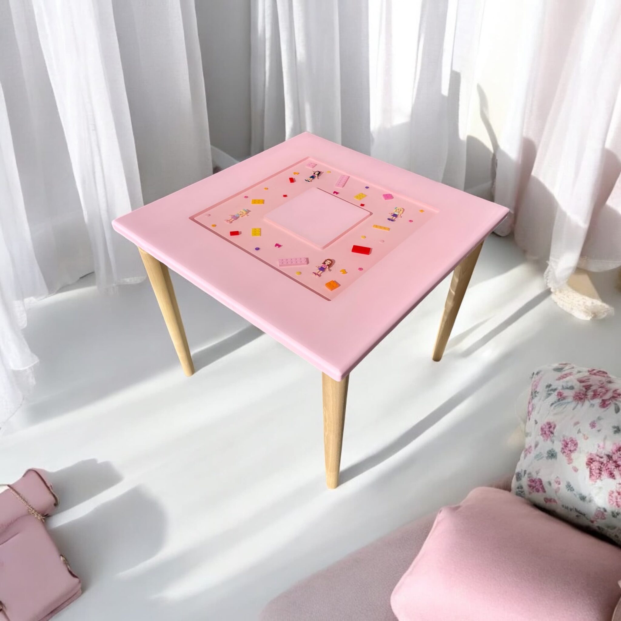 Blat stolika o wymiarach 55 cm x 55 cm charakteryzuje się unikalnym wcięciem, w którym umieszczone są oryginalne klocki znanej marki, zamknięte w trwałej żywicy epoksydowej. Dzięki temu, maluchy mogą bawić się w sposób twórczy, rozwijając swoją wyobraźnię i zdolności manualne. Powierzchnia stolika jest odporna na promieniowanie UV, co zapewnia trwałość koloru i estetyki przez długi czas.