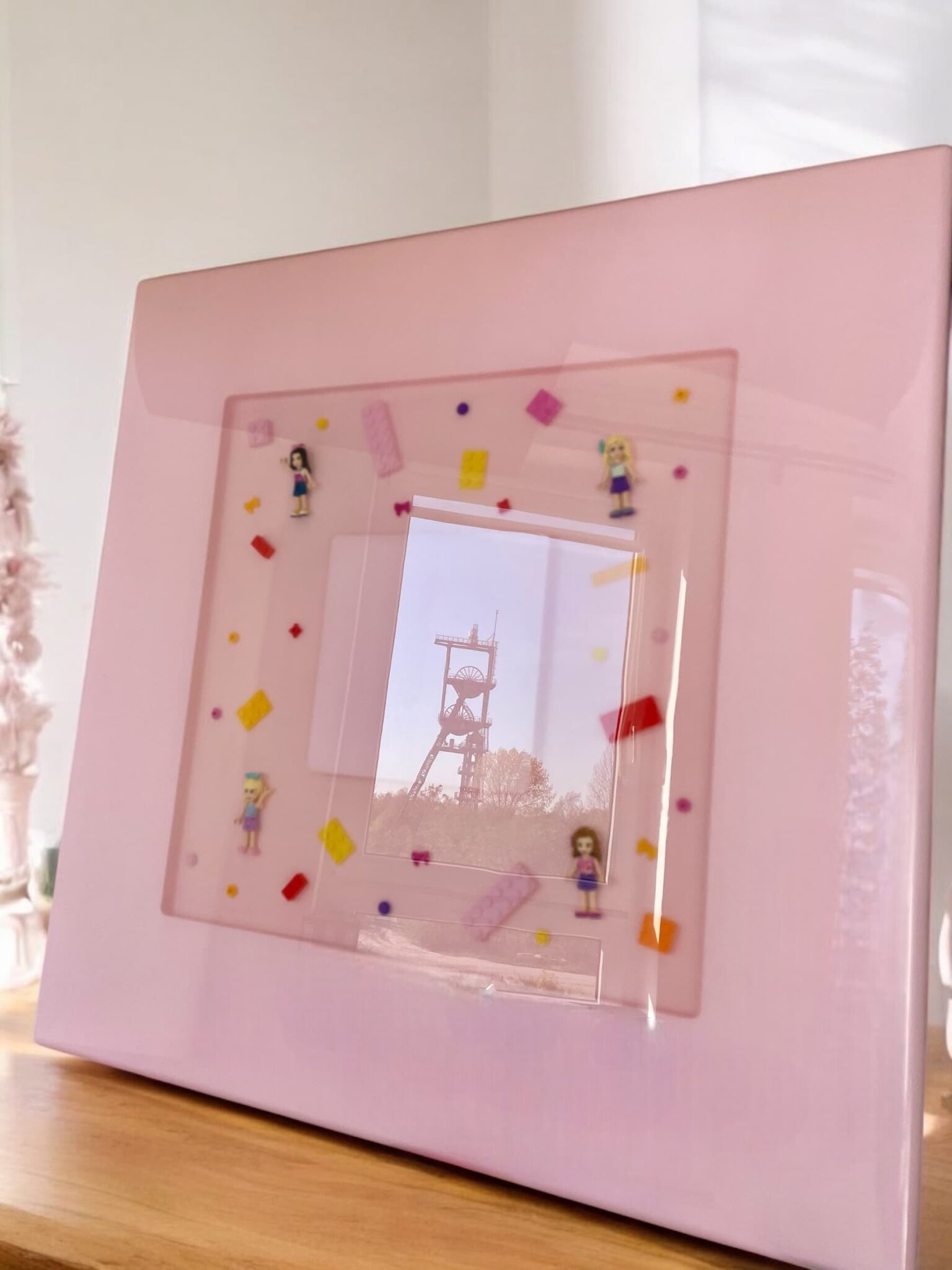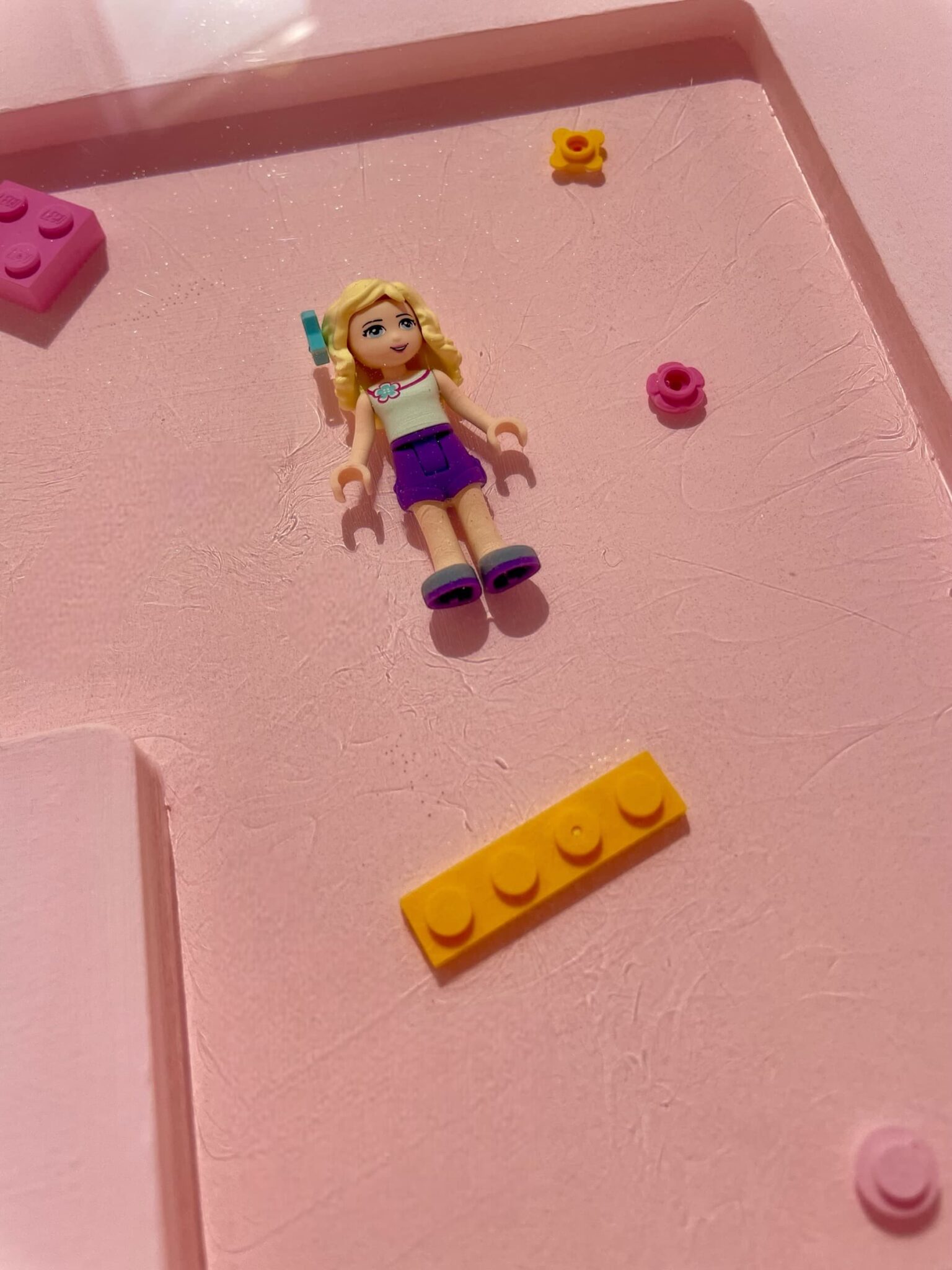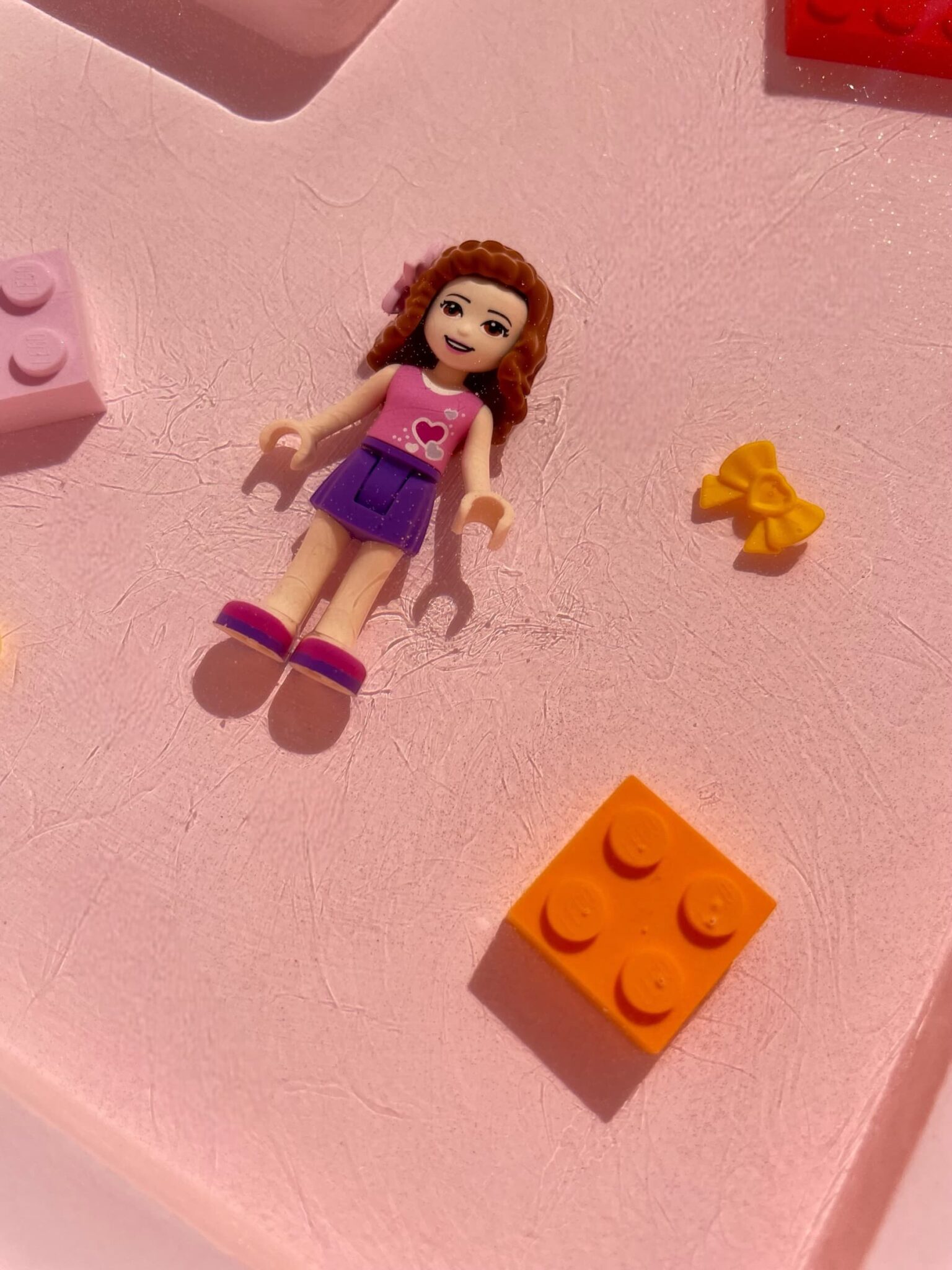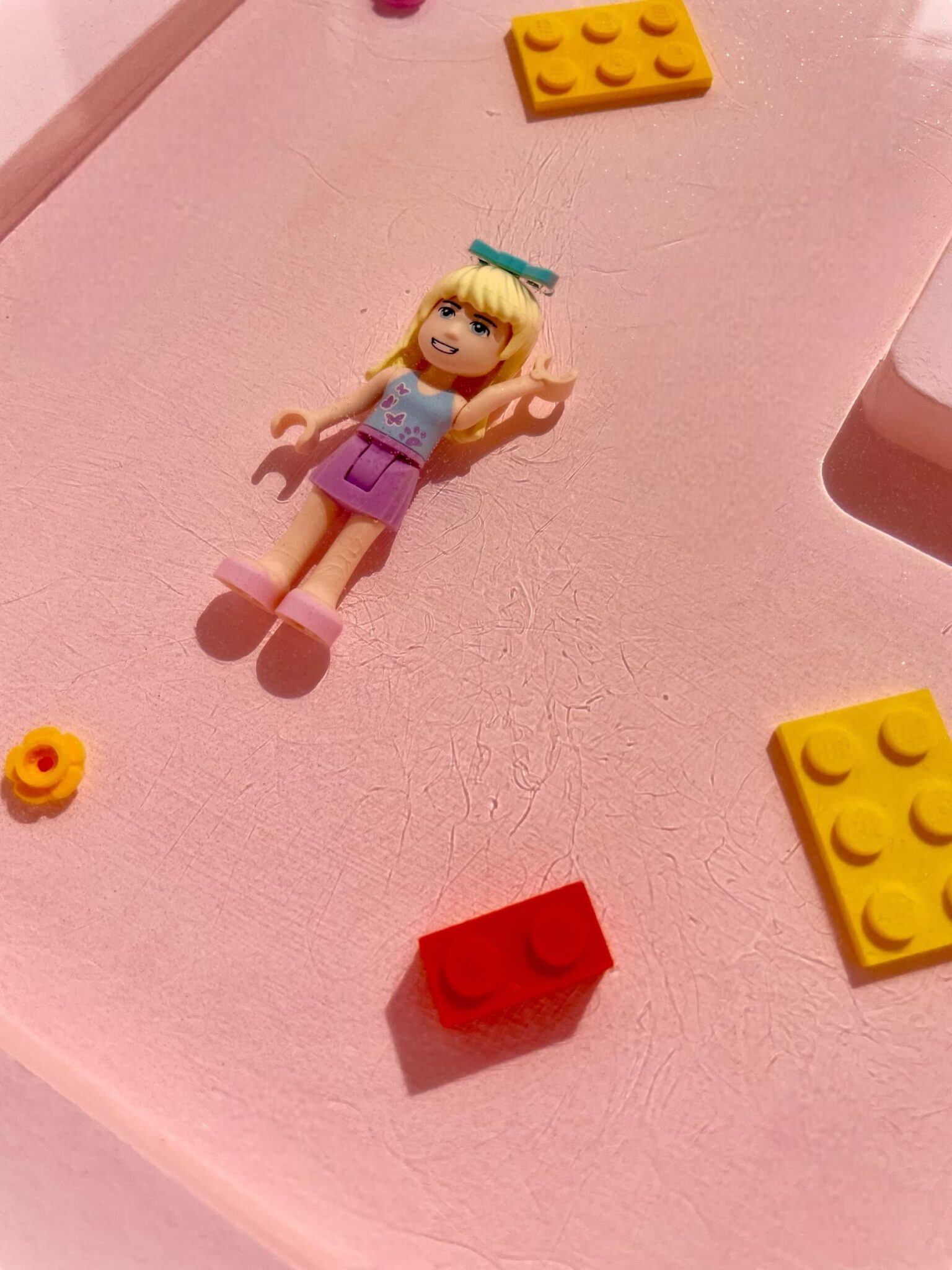 Blat stolika o wymiarach 55 cm x 55 cm charakteryzuje się unikalnym wcięciem, w którym umieszczone są oryginalne klocki znanej marki, zamknięte w trwałej żywicy epoksydowej. Dzięki temu, maluchy mogą bawić się w sposób twórczy, rozwijając swoją wyobraźnię i zdolności manualne. Powierzchnia stolika jest odporna na promieniowanie UV, co zapewnia trwałość koloru i estetyki przez długi czas.