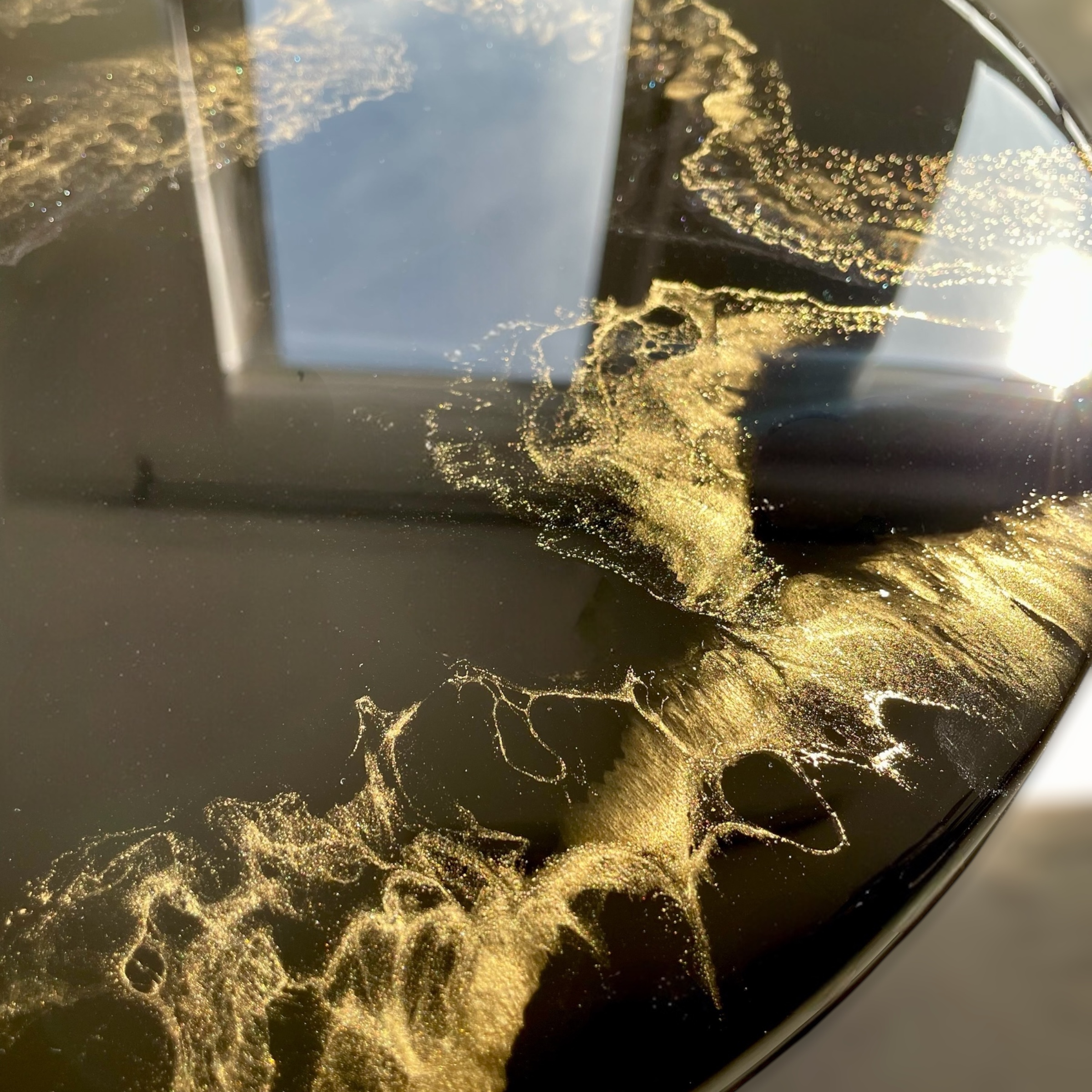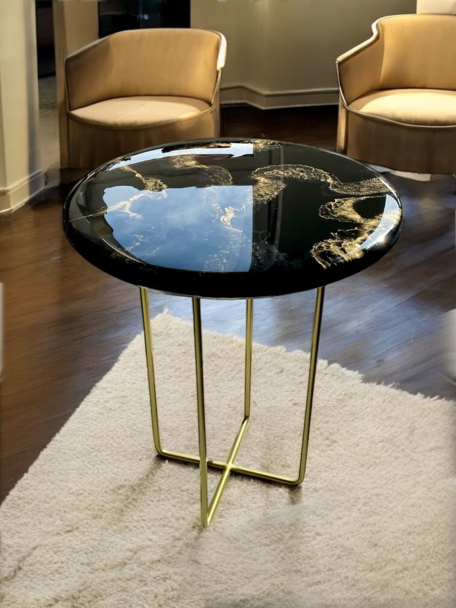 Blat o średnicy 45 cm, wykonany z solidnej płyty MDF o grubości 18 mm, został starannie zalany żywicą epoksydową w głębokim, eleganckim czarnym kolorze, ozdobionym subtelnymi złotymi akcentami. Efekt? Unikalny i przyciągający wzrok design, który stanie się prawdziwą ozdobą Twojego wnętrza.