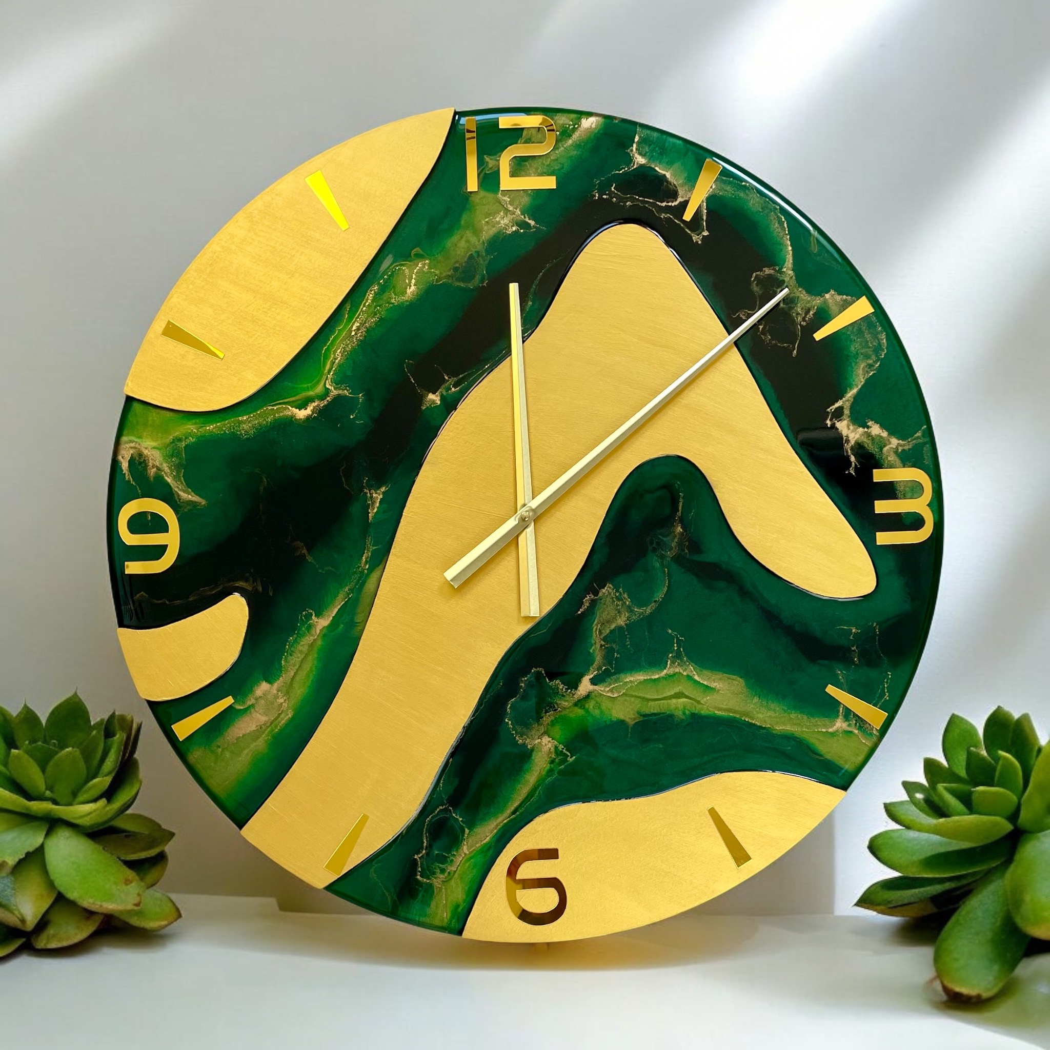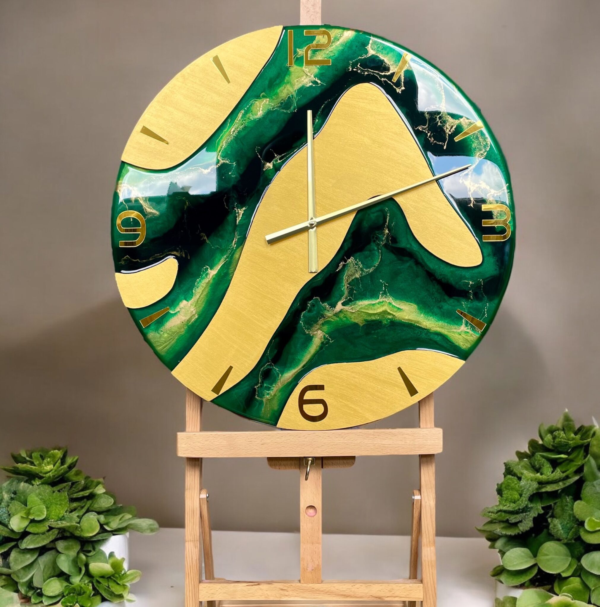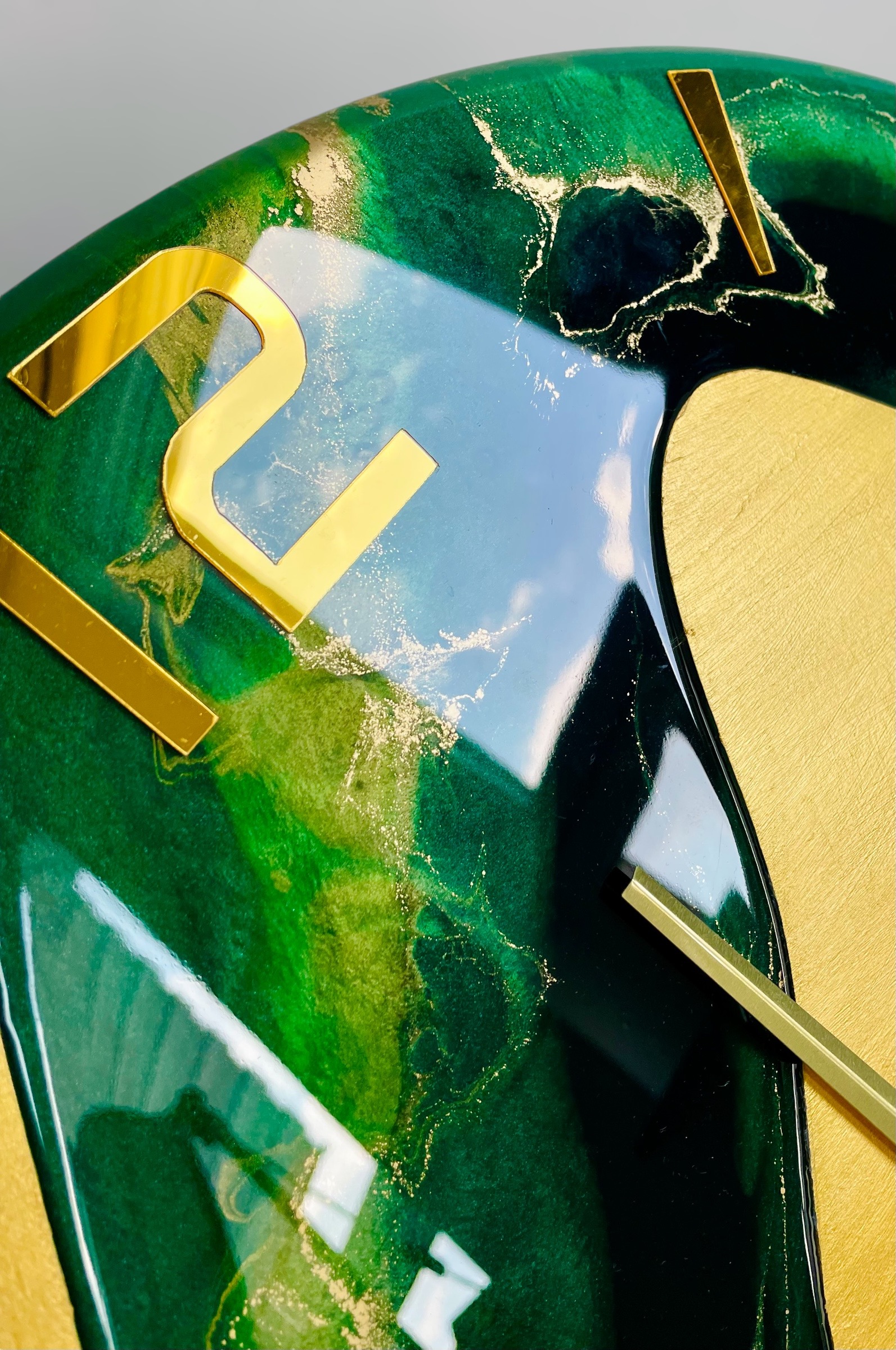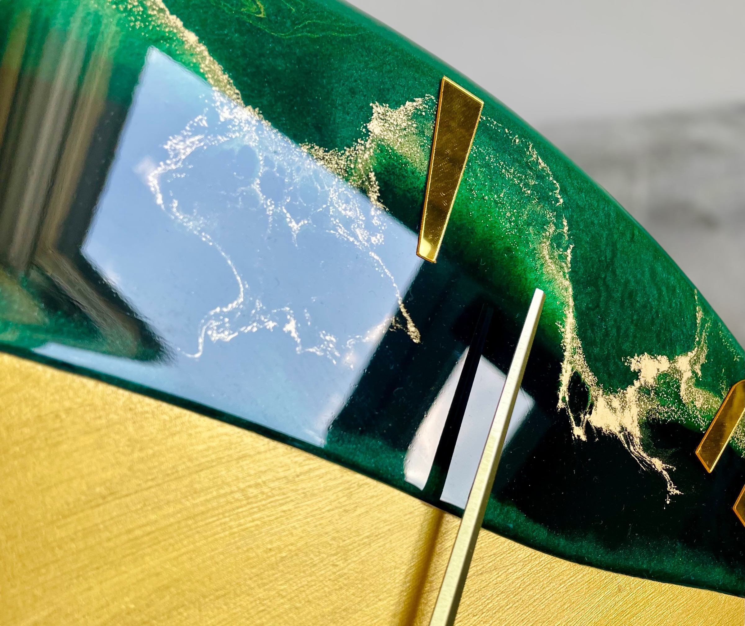 Jego design zachwyca połączeniem pięknych odcieni zieleni i złota z metaliczną farbą akrylową, która nadaje mu wyjątkowego blasku. Takie połączenie kolorów wprowadza do każdego pomieszczenia świeżość i nowoczesny charakter. Widoczne wcięcia są starannie zalane żywicą epoksydową odporną na uszkodzenia oraz promieniowanie UV, co zapewnia długowieczność i trwałość produktu. Pozostała część zegara pokryta jest metaliczną farbą akrylową, również odporną na działanie światła, co gwarantuje zachowanie intensywności kolorów na dłużej.