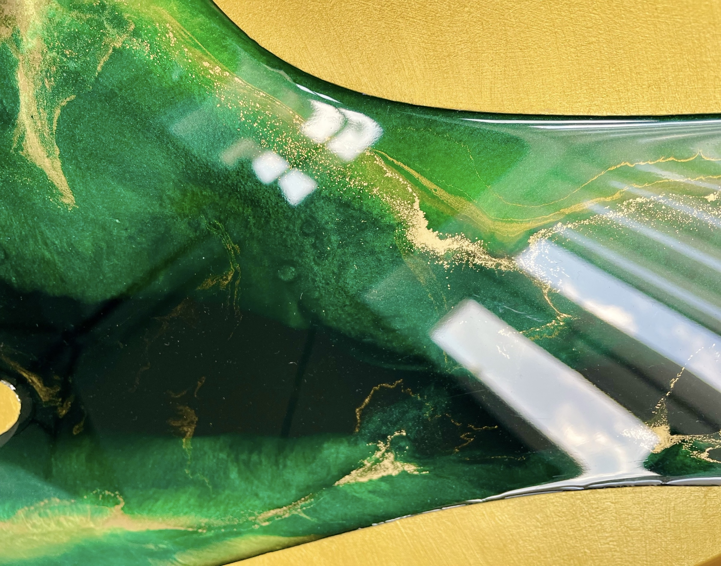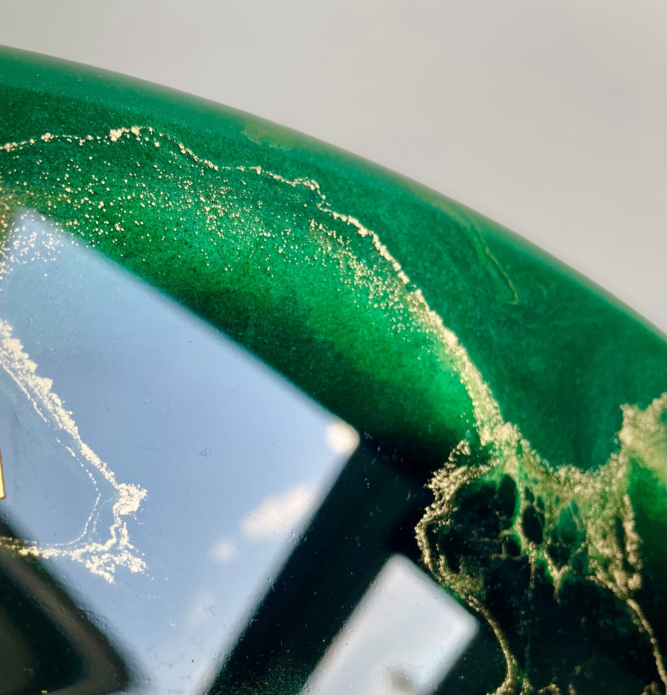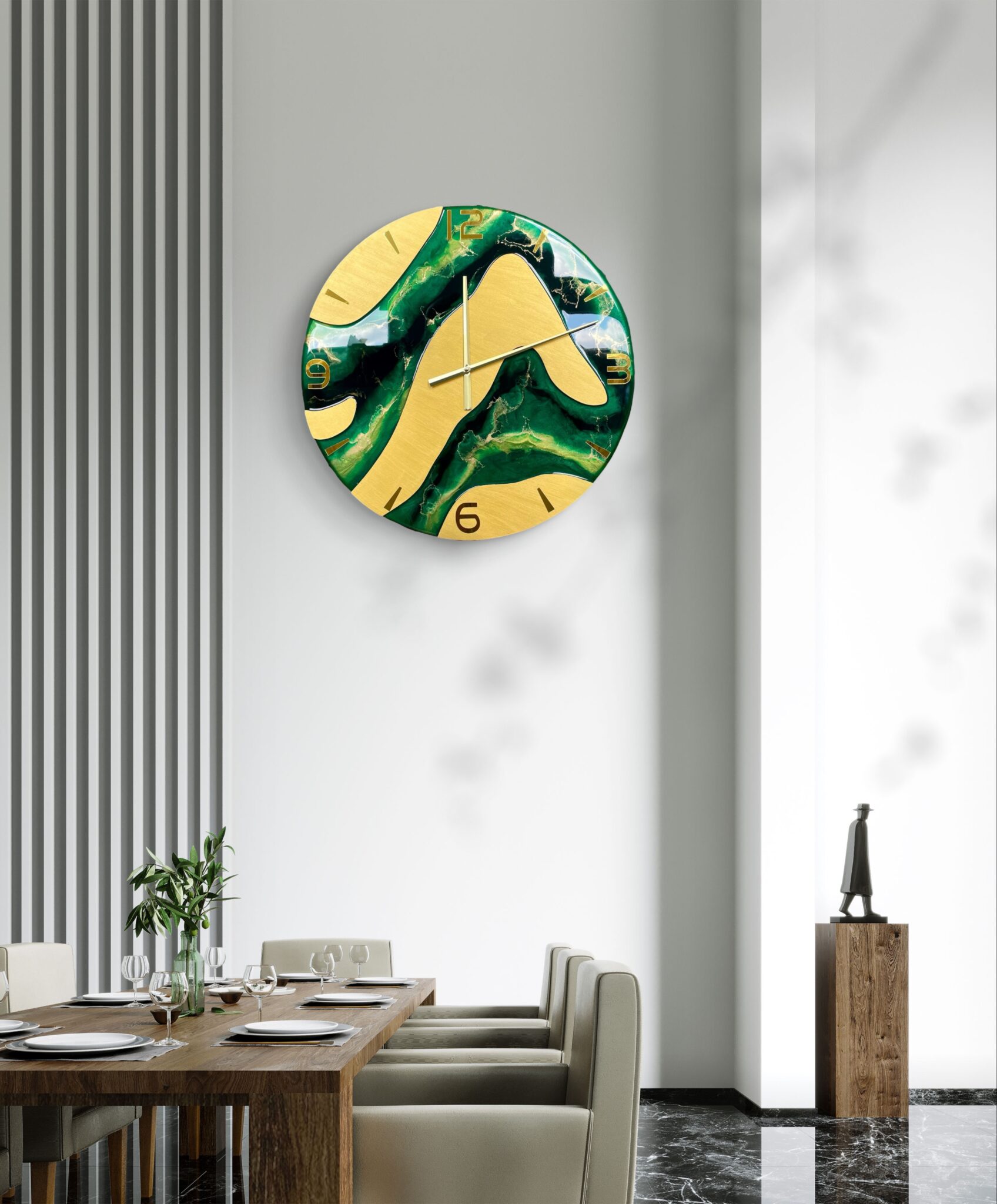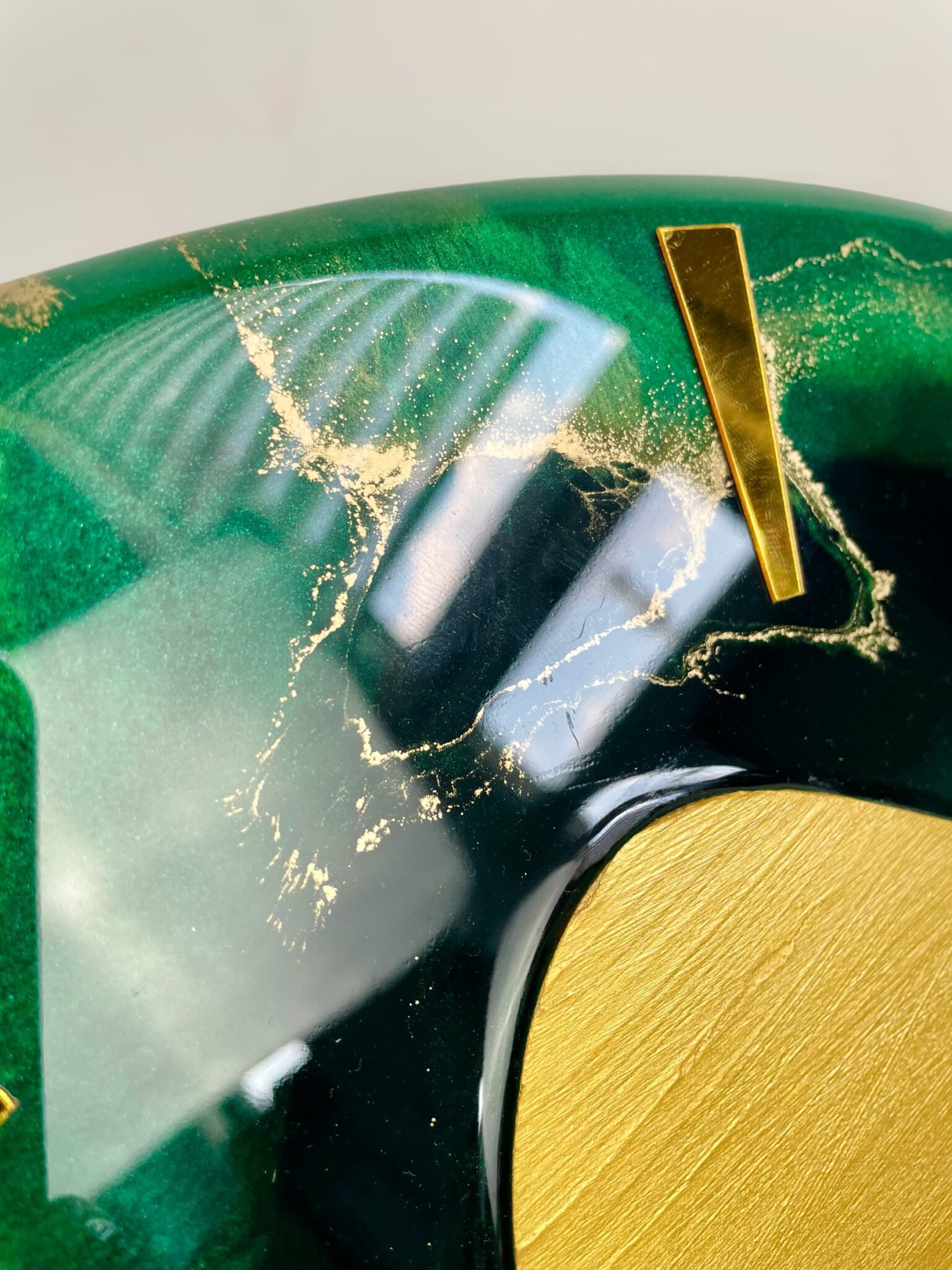 Jego design zachwyca połączeniem pięknych odcieni zieleni i złota z metaliczną farbą akrylową, która nadaje mu wyjątkowego blasku. Takie połączenie kolorów wprowadza do każdego pomieszczenia świeżość i nowoczesny charakter. Widoczne wcięcia są starannie zalane żywicą epoksydową odporną na uszkodzenia oraz promieniowanie UV, co zapewnia długowieczność i trwałość produktu. Pozostała część zegara pokryta jest metaliczną farbą akrylową, również odporną na działanie światła, co gwarantuje zachowanie intensywności kolorów na dłużej.