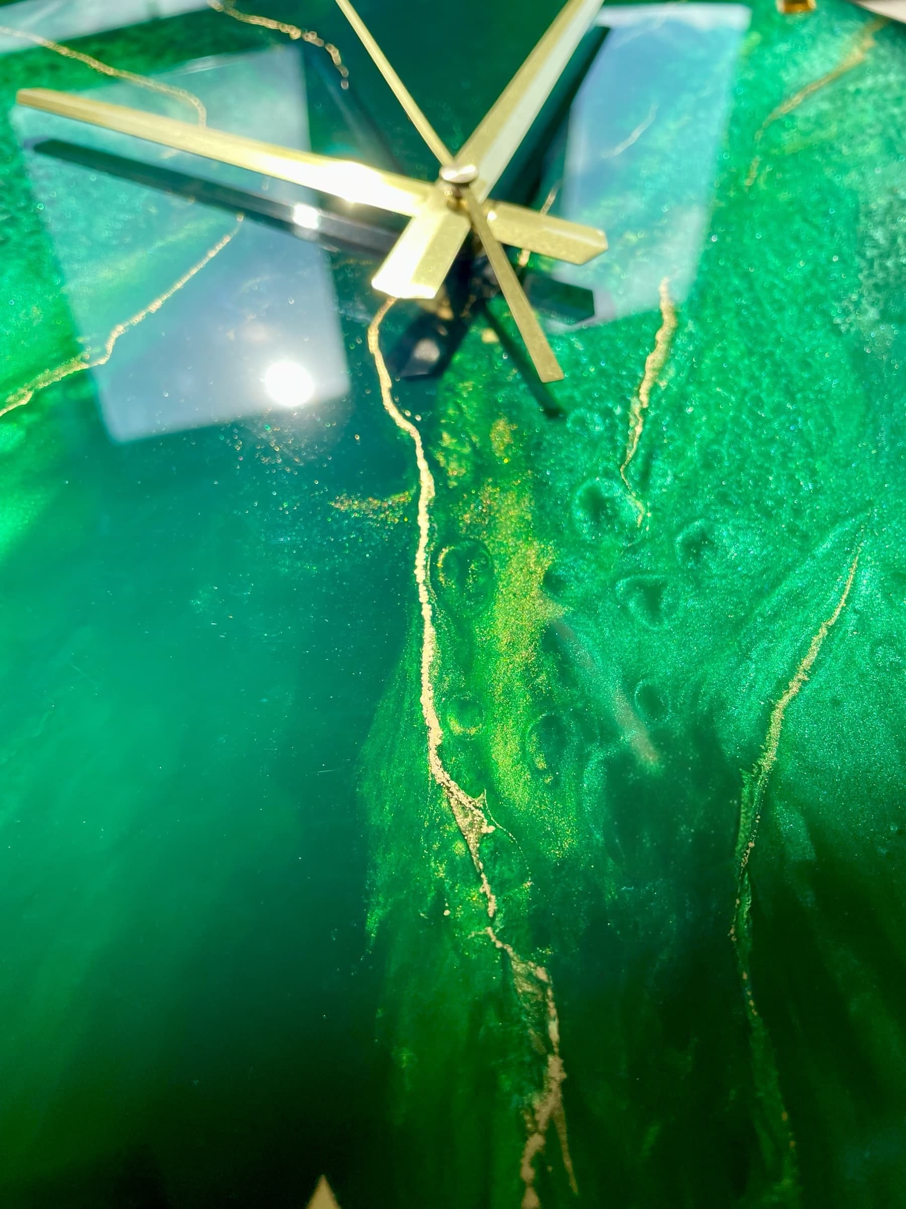 Zielony Zegar Ścienny z Żywicy Epoksydowej ze Złotymi Akcentami – 40 cm, cichy mechanizm